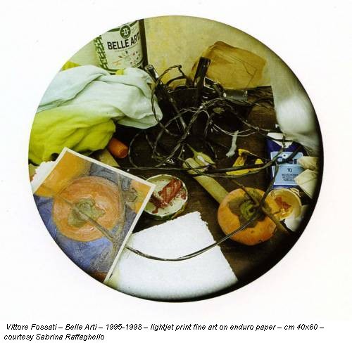 “Belle Arti”, in questo caso un abbinamento lessicale dal potere mistificatorio, ma che è anche il nome di un’essenza di trementina, un titolo e una garanzia, nonché «le uniche parole che compaiono in tutta la serie» come afferma lo stesso Fossati. Due parole che diventano fuorvianti nel momento in cui gli scatti cominciano a presentare l’arte in formulazione antiaccademica e antirigorosa, anche un po’ volutamente tangenziale nelle tracce di colore che sporcano un tavolo o lo schienale di una sedia, accidenti che fanno subito atmosfera pittorica. Non a caso l’imprecisione “sporca” è una costante, la “chicca” inserita nel bel mezzo di quell’accortezza per i dettagli di cui le immagini di Fossati presentano un uso patologico; e il suo incontro con la perfezione del cerchio (o sfera trompe l’oeil) sublima la retorica di un panneggio ricco di pieghe e imbrattato di terra, dove giocare con forme e colori equivale ad immortalare insieme, ma su piani diversi, la naturalezza di un pomodoro rosso e l’artificialità di una pallina blu.