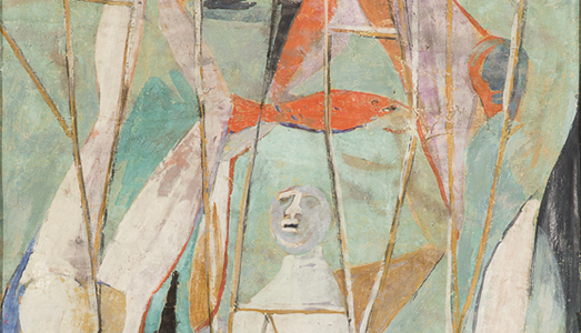 Due i dati significativi della biografia di Sergio Selva da dichiarare subito, per inquadrare il suo lavoro. Innanzi tutto il suo essere figlio d’arte, dello scultore Attilio, condiziona la sua ricerca: per distanziarsi dall’importante eredità paterna, mai Sergio si dedica alla scultura ma sceglie la pittura come linguaggio, declinata anche nelle varianti del disegno, dell’affresco, del mosaico e del collage. La storia familiare – oltre al padre, gli zii sono gli artisti Pietro Gaudenzi e Carlo e Mario Toppi – ha sicuramente instradato il giovane e precoce Sergio, che inizia a fare mostre sin dai quindici anni ed espone sedicenne alla Quadriennale romana, dove continuerà a essere invitato fino agli anni Settanta, mentre la Biennale di Venezia lo annovera tra gli artisti dal ‘36 al ‘56. Se il prestigio e le conoscenze del padre lo facilitano, Sergio Selva cerca la sua personalità e, dopo un manifesto dialogo con modelli coevi (soprattutto Cavalli, Capogrossi, Mafai, Pirandello e Scipione ma anche Picasso), arrive a trovare la misura alla fine degli anni Sessanta in una dimensione di sospensione che ripensa i temi di una vita con un linguaggio ormai smaterializzato, di lirismo distillato, sempre più essenziale: “pochi toni delicati tendenti alla monocromia – scrive il curatore Manuel Carrera nel testo in catalogo – orchestrati con eleganza e una profonda sensibilità decorativa” dettano “ritmi distesi e silhouette appena delineate”.