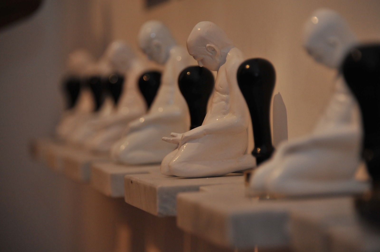 Seguendo questo percorso ideale, si comincia con la regolarità, base dell’opera di Claudio Beorchia, Pool. Si tratta di parte di un progetto più ampio, Isoman, che Beorchia ha realizzato ricercando la possibilità di ridurre la figura umana, spoglia di qualsiasi emozione, a una riproduzione regolare di moduli. In Pool, piscina in inglese, questo concetto prende forma grazie alla composizione di specchi di forma quadrata. Si assiste al superamento della dimensione emotiva dell’uomo, che torna nel momento di riposo, con un tuffo in piscina. Proseguendo, con l’opera di Antonella Raio, Genuflessione, la regolarità torna protagonista con l’alternanza della profondità di piccole sculture, della superficie del timbro e della ceralacca sul foglio. Tre elementi che analizzano il gesto dell’inginocchiarsi, un’azione che può indicare sia sudditanza, sia meditazione e riflessione. La reiterazione e la regolarità del gesto sono al centro della ricerca anche nel video Concierto a 64 manos di Calixto Ramirez. L’artista fa diventare una parte del corpo, la mano, l’unico strumento attraverso il cui battito cadenzato sul pentagramma è possibile riprodurre l’armonia di una composizione musicale. Terminata la sezione dedicata alla regolarità si passa all’eleganza del “bel carattere”. E qui bene si sposa l’opera L’estetica dell’apocalisse di Pamela Diamante. Un insieme di composizioni fotografiche che associano un’immagine realizzata da un altro artista, a quella di un evento catastrofico o di una calamità naturale. Una “estetica del dramma” che nel mondo odierno è possibile grazie alla sovrapposizione della comunicazione veloce via web dei disastri del nostro tempo. Sempre legato a un concetto di eleganza e nitidezza si associa la ricerca di Flaviano Esposito, Specola, una riproduzione nitida e perfetta di un paesaggio contemporaneo, quasi futuristico, generato da flussi di informazioni che circonda ormai l’uomo. L’individuo è così alla ricerca di nuovi punti di riferimento per orientarsi e cercare un proprio equilibrio tra i ricordi di un mondo tangibile, ma ormai perduto, e uno astratto, matematico, indirizzato verso il futuro.
