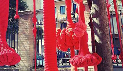 Nel cortile si trovano due sue installazioni: la prima “Senza Titolo” è composta da lunghe strutture di lana e di cotone lavorate all’uncinetto dalle tante sfumature di rosso, perfettamente adagiate in un albero in cui cambiano completamente la colorazione quasi a rapportarci in un mondo nel quale il confine tra il reale ed il fantastico è dato solo dalla propria volontà.
