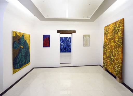 “Paesaggi della Mente” rende omaggio alle atmosfere energetiche che l’artista trovava – e ritrova ancora oggi – fra le Montagne verdi, la Montagna rossa o le Fusioni Minerarie, opere che lui realizza negli anni Novanta, avvicinandosi ad un linguaggio più vicino al figurativo rispetto alla successiva ricerca, che risentirà dell’influenza dell’espressionismo astratto. Un paesaggio roccioso, che affonda le mani nella materia viva, ma che allo stesso tempo sfugge al visibile per addentrasi nelle stratificazioni più buie della superficie terrestre, alla ricerca del microcosmo. Un percorso fatto di spinte ascensionali e discensionali, di moti che dal basso spingono verso l’alto; una via che – nelle opere – l’arte e la scienza percorrono insieme alla ricerca del suono perfetto: l’armonia del cosmo.
