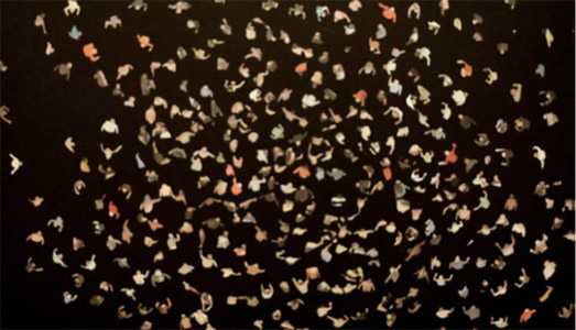 Non dipinge degli astri Galliano ma delle persone, il punto di osservazione è ribaltato, sollevato. Sono gli uomini in queste opere ad essere osservati come entità distanti e distinte nel buio che, nel collage e nell’olio, che occupa la parete principale dello spazio, circonda uomini e donne. Per la prima volta i lavori di questa serie vengono esposti insieme dopo aver viaggiato in mostre pubbliche tra Sudamerica e Marocco. In astrologia le costellazioni sono i raggruppamenti delle stelle sulla volta celeste, le masse sono l’affascinante trasposizione in Terra di un mondo così lontano e così poetico, Galliano stesso dice: «Cerco la bellezza nelle masse. Sono interessato alla solitudine e nei miei quadri è un tema ricorrente». Non interagiscono tra loro le figure umane dipinte, sono accostate l’una all’altra ma la sensazione di vicinanza che trasmettono allo spettatore è puramente fisica, non c’è interazione di sentimenti o di intelletto, sembrano punti fermi come le stelle del firmamento.