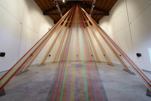 L’uomo contemporaneo, specchio della propria evoluzione, guarda al futuro con la curiosità degli esploratori di nuove galassie e al passato con la malinconia di chi cerca ancora l’Età dell’oro. Ma il tempo non ha linearità e quanto possiamo dirci figli di chi ci ha preceduto?in che momento le nostre emozioni tornano ad essere visceralmente legate alla scoperta della realtà che ci circonda? Queste sono alcune delle riflessioni che scaturiscono dalla mostra di Matteo Nasini allestita al Centro Arti Visive Pescheria di Pesaro con la curatela di Marcello Smarrelli. La navata d’ingresso ci accoglie con un’invasione cromatica; una fitta serie di oggetti realizzati con coloratissimi fili di lana. Sembrano simulacri di colonne che, forse, in un altro tempo componevano un’architettura, ma ricordano anche enormi figure estruse fuori scala, o oggetti di design dal gusto anni settanta.