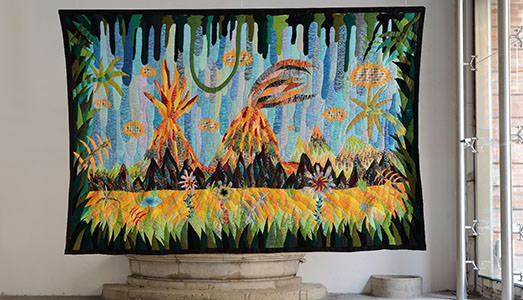 Una prospettiva lunga che corre tra i colori, guida l’occhio fino al grande arazzo di fondo (principio selvatico), perfetta scenografia teatrale che ci svela, mostrando il proprio retro, il complesso ricamo su cui si costruisce la descrizione di un paesaggio primordiale. Tra vulcani in piena esplosione e vegetazione rigogliosa l’uomo è ancora assente e osserva il suo inizio rendendo ancora più potente la forza della natura primigenia. Siamo apparentemente proiettati in un passato ancestrale ma la chiave di lettura che collega ciò che è stato e ciò che è, la troviamo proprio percorrendo il fitto intrico di colonne: quasi abbandonata, come oggetto tra altri oggetti, si nasconde una ruota decorata. La prima invenzione dell’uomo diviene qui simbolo della tecnologia, costante sfida dell’umanità tutta, a rincorrere, interpretare e superare le leggi della natura.