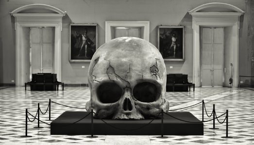 D’altra parte, quando qualcosa entra nel circuito diventa reale per forza di autorità. Già Duchamp lo sapeva bene e tutti gli altri ci credevano. Poi, non possiamo non fidarci della parola scritta dei libri, dalla Gigantologia dell’affatto fededegno Emiddio Manzi al volume dei Principi di Scienza Nuova di Giambattista Vico, consunti dal tempo ed esposti come apparati documentari della mostra in teche trasparenti, che affermano, senza tema di smentita, l’esistenza provata di intere popolazioni di giganti. Forse un gigante non può essere un artista? Magari un artista un po’ goffo per gli attuali standard sociali ma, a giudicare dall’ampiezza cranica, un paio di metri circa, dotato di una prospettiva mentale e di una capacità percettiva decisamente fuori dall’ordinario. Entrando nell’ampia Sala della Meridiana del Museo, non si può non provare un brivido di soggezione, dopo essere stati squadrati da quelle abnormi orbite cieche che, migliaia di anni fa, osservavano le cose illuminate per restituirne l’immagine.