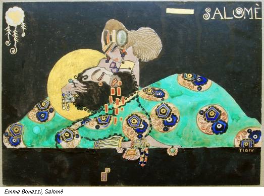 Le atmosfere che si respirano nella maggior parte delle sale sono quelle del Decadentismo, dove le luci sono cupe e le donne ritratte sono creature tanto affascinanti quanto fatali, come Salomè, personaggio femminile protagonista di più opere, come quella di Emma Bonazzi, dove l’influenza di Gustav Klimt è evidente. Le donne sono le vere protagoniste dell’esposizione, raffinate, elegantemente vestite e dagli sguardi profondi, come la Signora con cappello nero di Amedeo Bocchi del 1914, testimonianza non solo della fortunata tipologia del ritratto femminile “con cappello”, ma anche della fortissima influenza del decorativismo klimtiano, qui più materico e dalle tinte tenui, che circonda questa donna aristocratica dallo sguardo melanconico. Accanto alle eleganti signore dell’alta borghesia trovano spazio anche le sensuali pose di nudo sia sulla tela, come Lisetta di Camillo Innocenti, dipinta nella posa dell’Olympia di Manet, e le sculture, come Enigma di Attilio Selva.