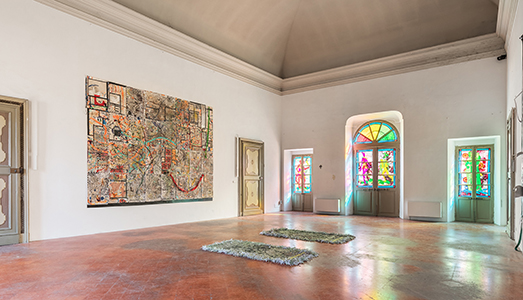 Sulle ampie vetrate delle sale principali, Raul applica un collage di vetri colorati, carta, legno, colla, nastro, perline e fogli di acetato che, giocando con i raggi di sole provenienti dalle finestre, creano e proiettano sul pavimento interno un fantastico arcobaleno calpestabile. Questa apparente allegria di colori, allude al ricordo del padre dell’artista, morto all’età di 33 anni, la stessa età in cui Raul presenta questa mostra. Con questa installazione, già presentata alla Whitney Biennial a New York quest’anno (e una delle opere più apprezzate e instagrammate della mostra) de Nieves tratta materie modeste con attenzione meticolosa, trasformando il quotidiano nel fantastico. Al contrario di molte tradizioni spirituali occidentali, l’artista rappresenta la morte come una metafora di trasformazione spettacolare e rinascita in un mondo imprevedibile e turbolento. Nel suo dialogo con l’iconografia del passato, con le tradizioni religiose e spirituali, l’artista rivela sempre un’attitudine positiva nei confronti dell’umanità. Il suo lavoro multimediale racconta la forza sorprendente della vita: l’artista traduce nelle sue creazioni la possibilità di un’esperienza fantastica traboccante di amore, commedia e promessa per un domani migliore.