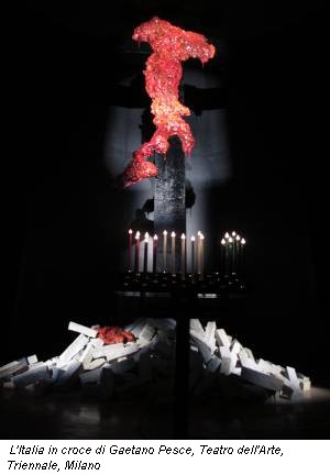 Teatro dell’Arte, comunica con forza e determinazione, in una dimensione di allusiva sacralità, funzionale alla messa in scena. L’Italia, raffigurata dalla forma consueta dello stivale, è ridotta a una massa sanguinolenta di carne, realizzata in resina, ed è appesa a una gigantesca croce di legno, nera, pulita ed essenziale. L’Italia crocifissa, offesa e martoriata, che sostituisce il Cristo, come in tante altre occasioni ci ha abituati l’arte contemporanea. Brandelli di carne cadono ai piedi della croce, dove sono accumulati detriti e rovine (i resti del terremoto dell’Aquila?) e falsi idoli distrutti. Davanti all’immagine di sofferenza, catalizzatrice di ogni sguardo, in ipnotica riflessione, alcuni ceri accesi, del colore della bandiera, e ancora, nel mezzo dell’atrio-navata, un leggio su cui è posata la Costituzione. Il pubblico può ammirare l’opera seduto su banchi da chiesa, mentre suona l’inno nazionale, simile a un canto religioso, o il vociare di una moltitudine, le parole del popolo italiano. Se ciò non bastasse il comunicato stampa della mostra riporta uno scritto dell’artista, datato