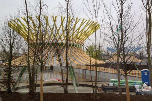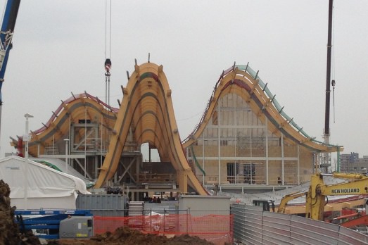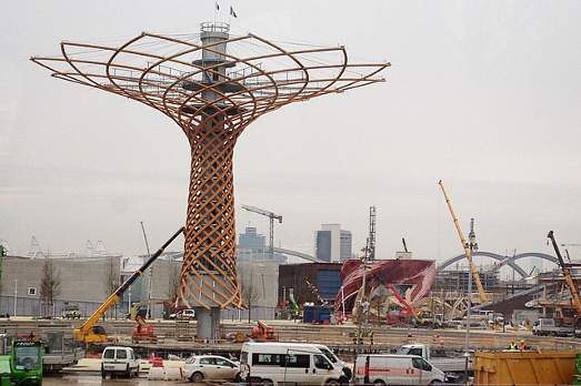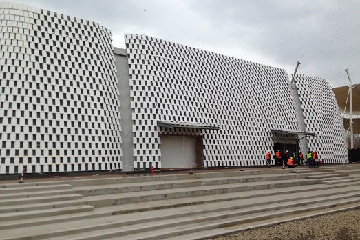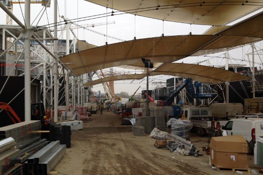 Entrare nel sito di Expo Milano a un mese di distanza del suo opening è un’esperienza non comune. E che ci permette, finalmente, di fare un punto della situazione oggettivo. Tanto per cominciare le leggere piogge di questi giorni non incitano alla positività, specialmente quando ci si para davanti agli occhi una distesa di gru, camion, furgoni, container, strisce segnaletiche, transenne, dissuasori e chi più ne ha più ne metta, con centinaia di operai in pettorine gialle e arancioni che vanno avanti e indietro con auto e macchinari, generando un traffico sul Cardo e il Decumano (le due vie perpendicolari che formano il “paese Expo”, lunghe rispettivamente 350 e 1300 metri) che nemmeno nelle ore di punta nella vicina città.