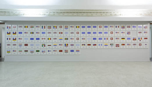 La prima sala della mostra è un colpo al cuore, un sussulto di bandiere giustapposte, che raccontano, pedissequamente, le nazioni di appartenenza delle persone a cui è stato assegnato il premio Nobel per la pace. Con buchi storici, che si riferiscono agli anni delle guerre mondiali, e con delle bandiere (vedi quella nazista) che suggeriscono riflessioni profonde in merito alla scelta di questi Nobel. Il lavoro di Stampone, con questo forte senso estetico, accompagna quindi lo spettatore in un viaggio di riflessioni, di pensieri, di approfondimenti. Fa pensare come il maggior numero di premi Nobel sia stato consegnato ai Paesi che più di altri hanno realizzato guerre, promosso tensioni politiche nel mondo, creato insidie. Dicotomie, paradossi di una realtà che viviamo e che speso siamo costretti a subire.