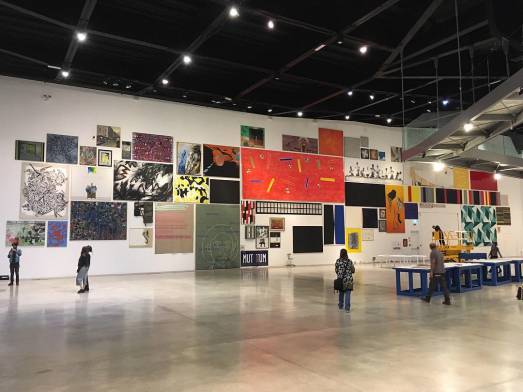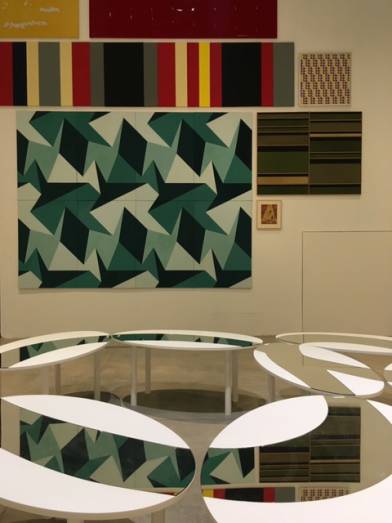 Dettaglio della Quadreria, Museo Macro, Roma, 2018 ; dipinto in basso di Sergio Lombardo, Mappa minimale toroidale di 5 paesi e 4 colori, 1997, vinilico su tela, cm 480 x 360 ; Tavolo di Michelangelo Pistoletto.