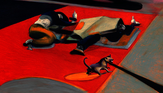 Caboto, sua prima opera storica, come pure Psiche, serie di illustrazioni proposte da Einaudi per una raccolta di opere di Freud, per proseguire con The Raven, Hansel&Gretel e la serie degli abbandoni, mettono in luce quel senso di claustrofobia e di inevitabile incaglio dell’essere umano nei meandri della sua psiche. L’indagine si sofferma sui flussi di coscienza, sulle ombre nascoste e sulle paure dell’essere umano, analizzate in passato dalla pittura simbolista ed espressionista. Immediati sono infatti i rimandi ad Alfred Kubin, Otto Dix, ma anche ai più contemporanei David Hockney e Francis Bacon, con le inquadrature taglienti, le ambientazioni solitarie, i corpi che si liquefanno e si fondono e confondono con lo sfondo. Decisamente incentrato sulle ‘luci’ e sulle gioie che provengono quasi sempre dai piccoli gesti, dalle attenzioni e da quella quotidianità che oggi tendiamo sempre più a banalizzare, il secondo piano. Seguiva un serie di volti femminili, per i quali l’autore ha provato attrazione, conclusi, come i paesaggi della Patagonia, dalla memoria o dall’immaginazione.