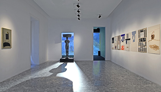 Di fronte a questa sfilata di carte che assorbono il tempo mitico dell’infanzia, una superficie dorata, piccola ma preziosa, rimanda alla sacralità dei fondi bizantini, accoglie le tracce di un’età sospesa, mostra una nicchia la cui plasticità invita a riflettere sul mutamento delle condizioni della pittura (della cultura) durante le varie epoche, dove si esprimono i processi generali di astrazione della mente umana. In questo percorso simbolico c’è, poi, una scultura bronzea (una figura femminile che sorregge un bacile da cui zampilla dell’acqua) che trasforma lo spazio della galleria in piazza, in hortus creativo, in perimetro alchemico dove si percepisce il mistero del fare e del contemplare, dell’agire nel campo dell’arte e del meditare sulla storia delle idee.