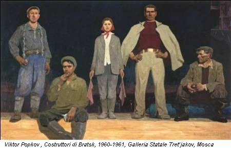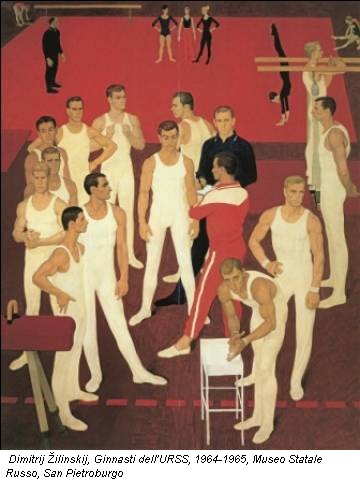 Il “Realismo socialista” trova la sua ufficializzazione negli anni ’30 con Stalin al potere: l’arte assume sempre più una dimensione utopica che prende forma nelle metafore del corpo, del volo, della gioventù; viene meno il pluralismo artistico e quindi le tendenze moderniste; oltre a quello di “proletariato” si afferma il concetto di popolo, visto anche in una dimensione ancestrale di unione biologica fra uomo e natura (Il bagno dei cavalli di Arkadij Plastov). Il periodo della seconda guerra mondiale, che nell’URSS prende il nome di “guerra patriottica”, vede opere come La madre del partigiano di Sergej Gerasimov (Mozhaysk 1885 – Mosca 1964) e Stalingrado di Vasilij Efanov (1900-1978), che rappresentano il coraggio e l’orgoglio della popolazione durante l’assedio nazista; mentre assumono caratteri trionfalistici, ripresi dal Barocco e dal Romanticismo, le opere successive alla vittoria del ’45 (Vasilij Jakovlev, Ritratto del maresciallo Georgij Ukov). Alla guerra succedono gli anni della “non-conflittualità” secondo l’idea che, con il venire meno delle classi nella società sovietica, non potevano più esistere conflitti sociali. Di qui rappresentazioni edulcorate della società come Pane di Tat’jana Jablonskaja (1917-1989). Con l’avvento di Chrušëev e la destalinizzazione questa corrente va esaurendosi a favore di uno “stile severo”. Artisti come Tair Salachov (Baku, 1928) e Viktor Popkov (Mosca 1932-1974) danno luogo ad immagini sintetiche ispirate a pittori occidentali come Renato Guttuso, ai muralisti messicani, allo stile di Deineka, con sagome dai contorni marcati, forme e sfondi semplificati quasi fino all’astrazione, che rendono emblematici e a tratti onirici momenti e personaggi staccandoli da un contesto. Nell’epoca di Brežnev il realismo socialista raggiunge il suo apice e la sua fine: Gelij Koržev rappresenta in Bruciati dal fuoco di guerra le conseguenze psicologiche della separazione, della perdita e del trauma fisico dovute alla guerra patriottica. L’arte diviene specchio di un ripiegamento individualistico: nel ’32 Corsa di Deineka mostrava un uomo che esisteva in quanto parte di una collettività, a trent’anni di distanza un dipinto sullo stesso tema, Ginnasti dell’URSS di Dmitri Žilinskij, presenta degli atleti slegati fra loro, disinteressati gli uni dagli altri. La monografica su Aleksandr Rodčenko arriva con slancio futurista.
