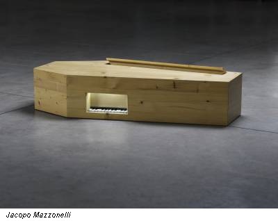 Che sia quella bara per bambino in legno con pianoforte giocattolo di Jacopo Mazzonelli, il simbolo della scultura, il messaggio per il suo futuro ?