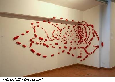 La scultura oggi, ha la forma di contenitori vuoti, colorati di rosso, quelli di cosmetici anti età, uniti in un vortice da un filo, nell’opera di Ketty Tagliatti ed Elisa Leorini.