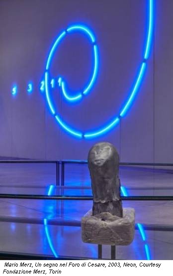 È uno spazio ordinato e metodico, dove entrambi gli artisti trovano eguale collocazione tra i fili dorati intessuti come fossero le corde di un’arpa o sovrapposti a formare un disegno di Marisa, superba nell’uso del rame o nell’intrecciare il nylon a creare le sue famose scarpette, che ne disegnano l’identità nell’assenza, evanescenti ed eteree; tra i grandi numeri di Fibonacci scritti da Mario nella sua famosa spirale in neon blu, perfetta nel dialogo con lo storico intervento dal titolo Un segno nel foro di Cesare che Merz realizzò nel 2003 nell’omonimo luogo, un’installazione che sottolinea la fortissima importanza simbolica che per l’artista assume la spirale: «In astronomia lo studio delle stelle e degli spazi intrastellari è quasi sempre correttamente preservabile attraverso spirali, quindi la spirale dai cieli celesti in questo caso si è spostata su un prato, che però è un prato particolare in quanto è un prato che copre delle tombe antiche e sostiene delle pietre di 2mila anni fa […]». La spirale diventa luogo dell’incontro tra i Merz, nei tavoli che l’artista realizza per la compagna per poter accogliere le sue opere. È un tempo di un abbraccio, tra la forza del tavolo – che allo stesso tempo ha la trasparenza del vetro – che lascia ‘vedere attraverso’ fino a trovare le piccole teste in argilla e terracotta di Marisa, una sequenza anch’essa come i numeri di Fibonacci, che cadenza lo spazio e che restituisce concretezza alla presenza di entrambi alla realizzazione dell’opera.
