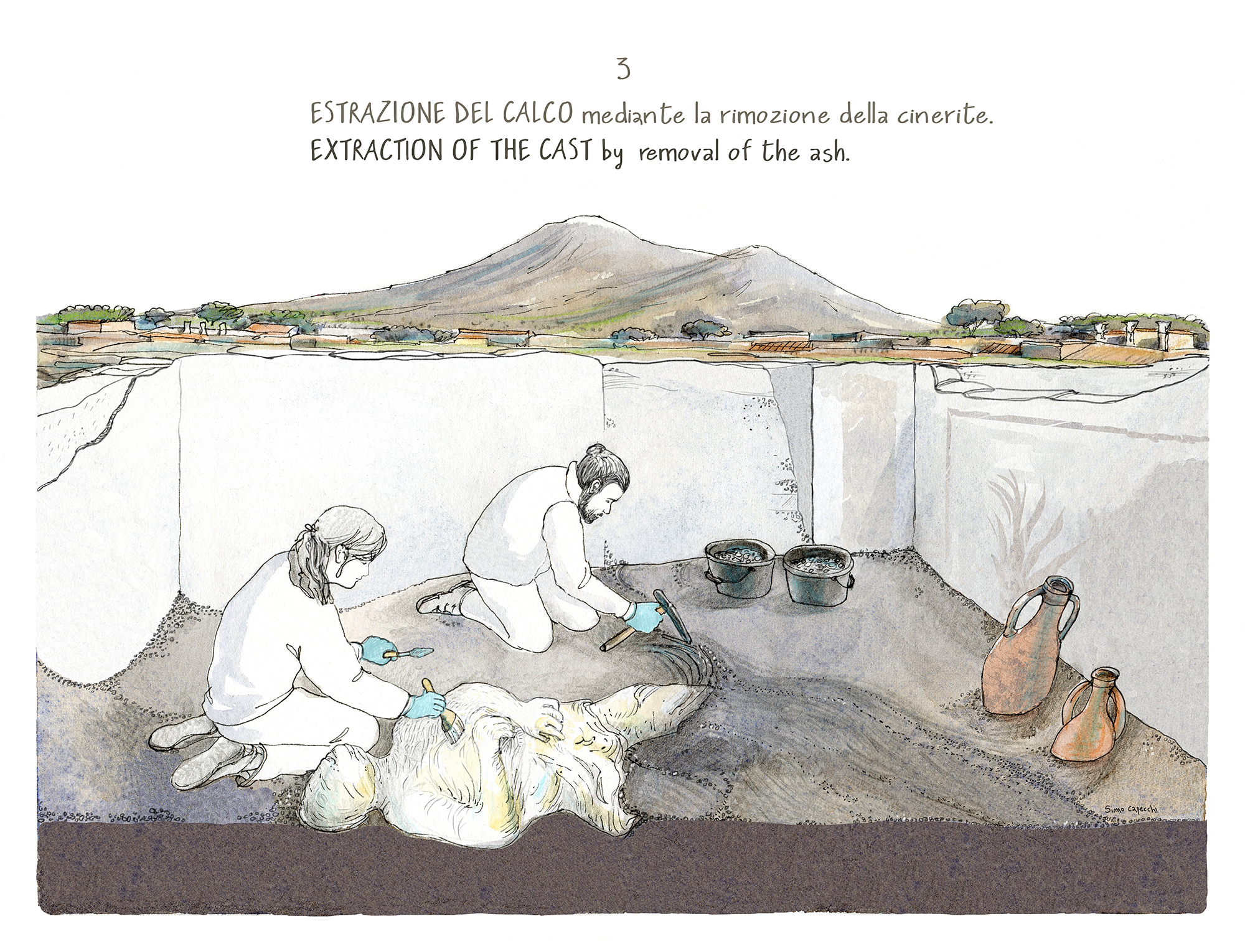 L’eruzione che distrusse Pompei e le città vesuviane fu un evento improvviso e devastante. Dopo una prima fase caratterizzata dalla caduta di pomici e lapilli, una nube ardente di cenere e gas. la cosiddetta corrente piroclastica, investì la città, causando la morte di migliaia di persone. I corpi degli abitanti furono rapidamente ricoperti dal materiale vulcanico che, solidificandosi, conservò l’impronta delle loro forme.