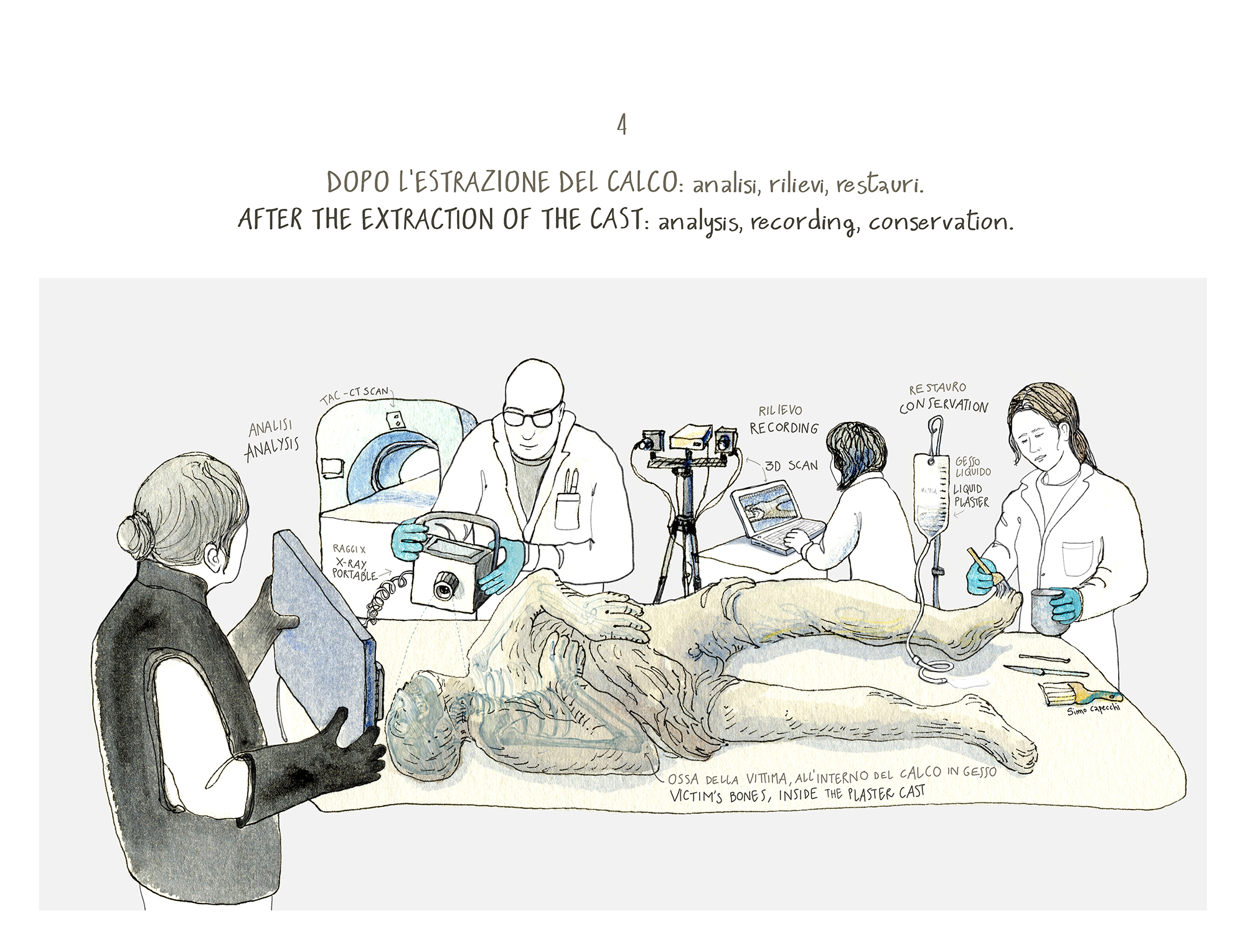 La scelta museografica punta a evitare qualsiasi spettacolarizzazione. L’apparato grafico riduce al minimo colori e decorazioni, privilegiando testi essenziali e fotografie d’archivio che documentano i momenti degli scavi e del restauro. Il racconto è accompagnato da contenuti multimediali che spiegano l’evoluzione della tecnica dei calchi e mostrano, attraverso immagini ottenute con TAC, la struttura interna di alcuni esemplari.