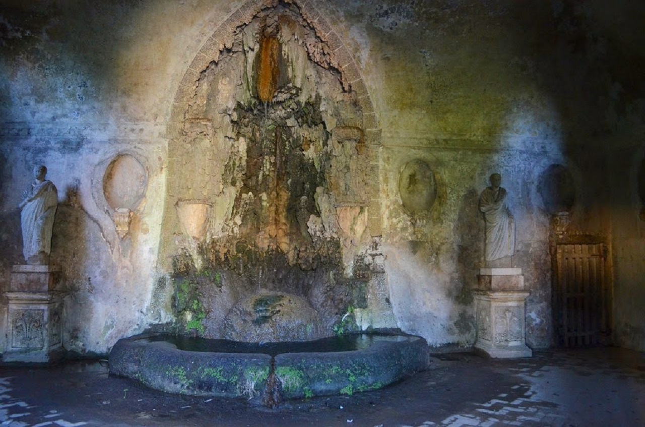 Il Ninfeo era costituito da un corpo centrale coperto da una volta a cupola, dalla quale l’acqua scendeva secondo un effetto a pioggia, mentre altra acqua sgorgava dalle nicchie ricavate dalla quinta teatrale del Ninfeo, dove tre satiri sostenevano gli specchi che danno il nome al Ninfeo.