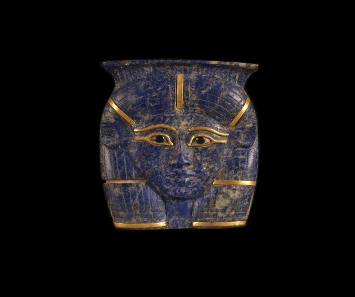 Hathor Head amulet with gold inlay. Dynasty 22. Lapis Lazuli, gold. H: 5,5 cm. W: 5,3 cm. Egyptian Museum, Cairo. Photo credit: © Fotografie di Massimo Listri