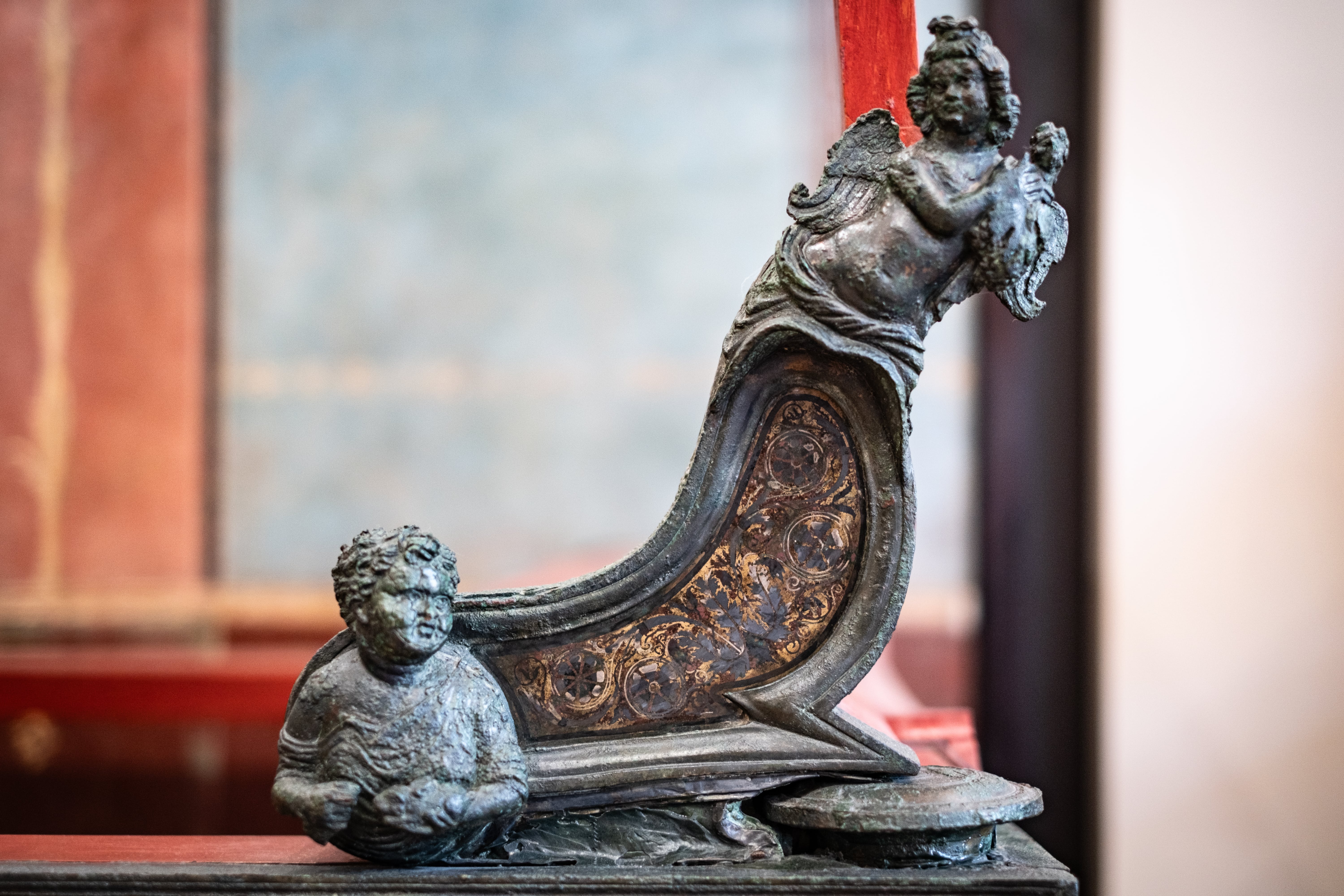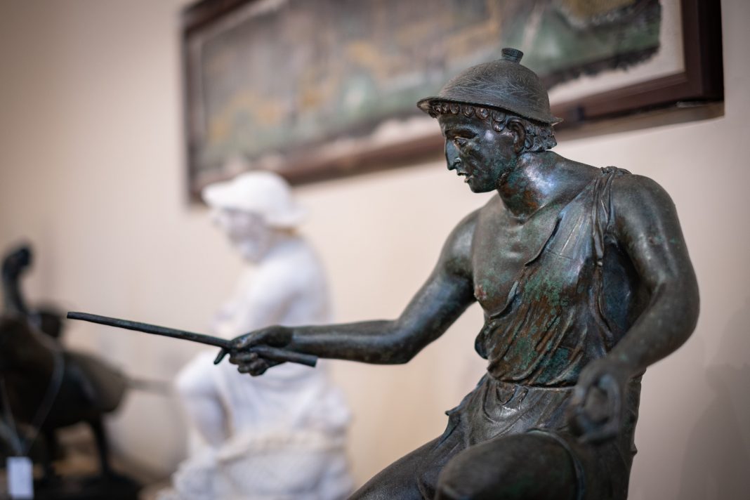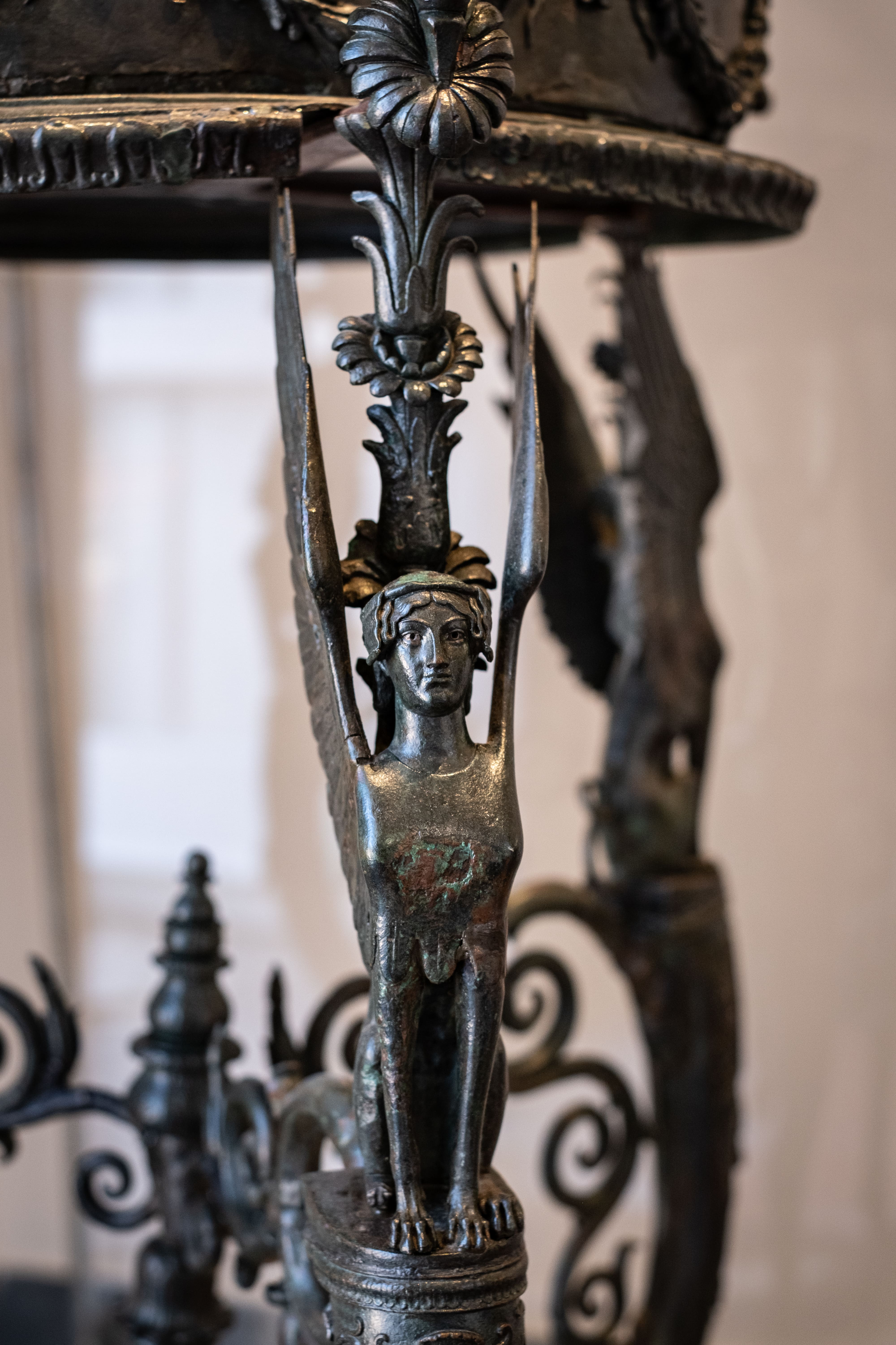 Altrettanto suggestivo è il tavolino monopode con sfinge, che abbina elementi decorativi e simbolici come la figura della dea Atena e motivi zoomorfi. Di particolare bellezza la statua bronzea di Apollo, rappresentato mentre suona la cetra, che testimonia l’ispirazione greca dominante nella statuaria romana.