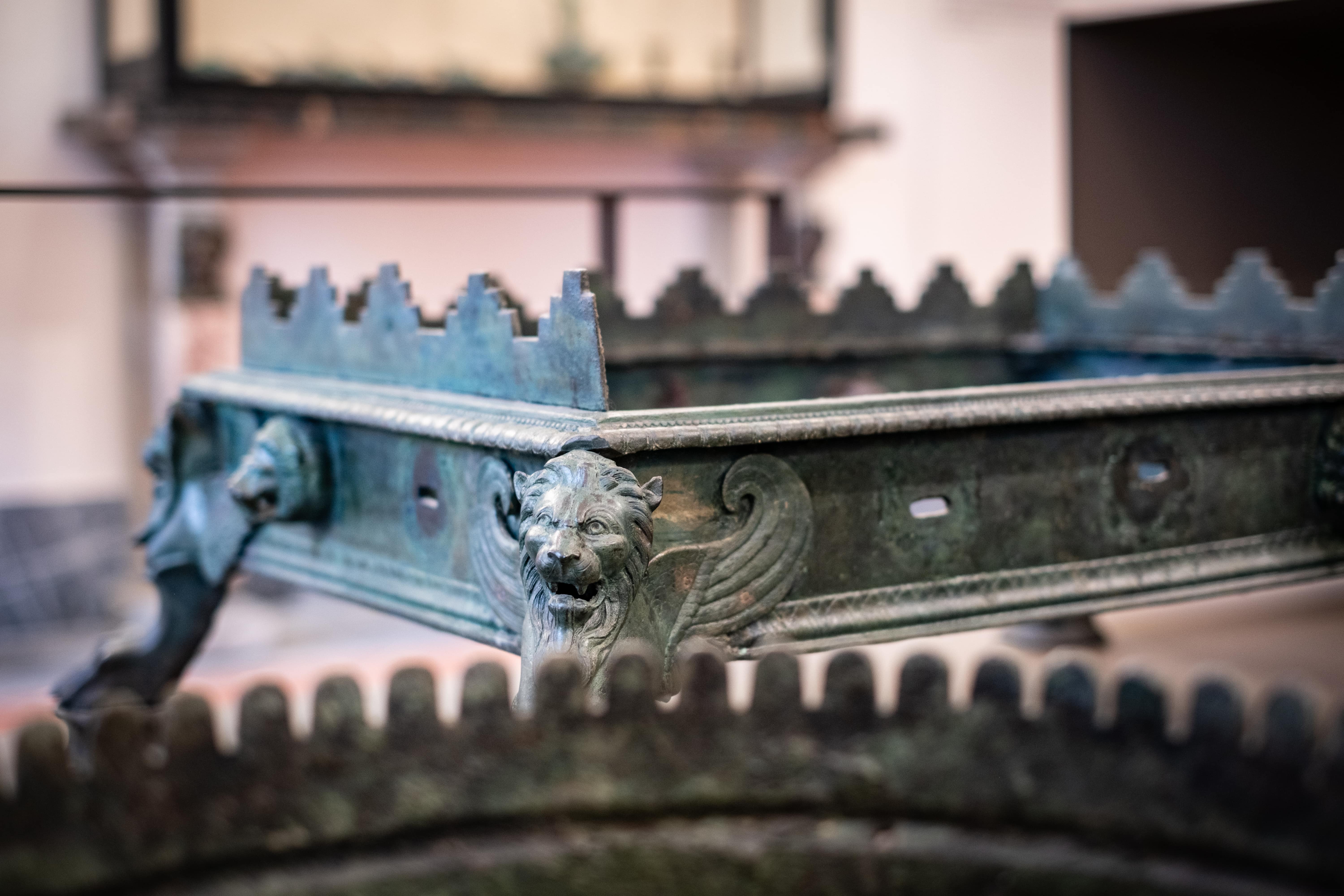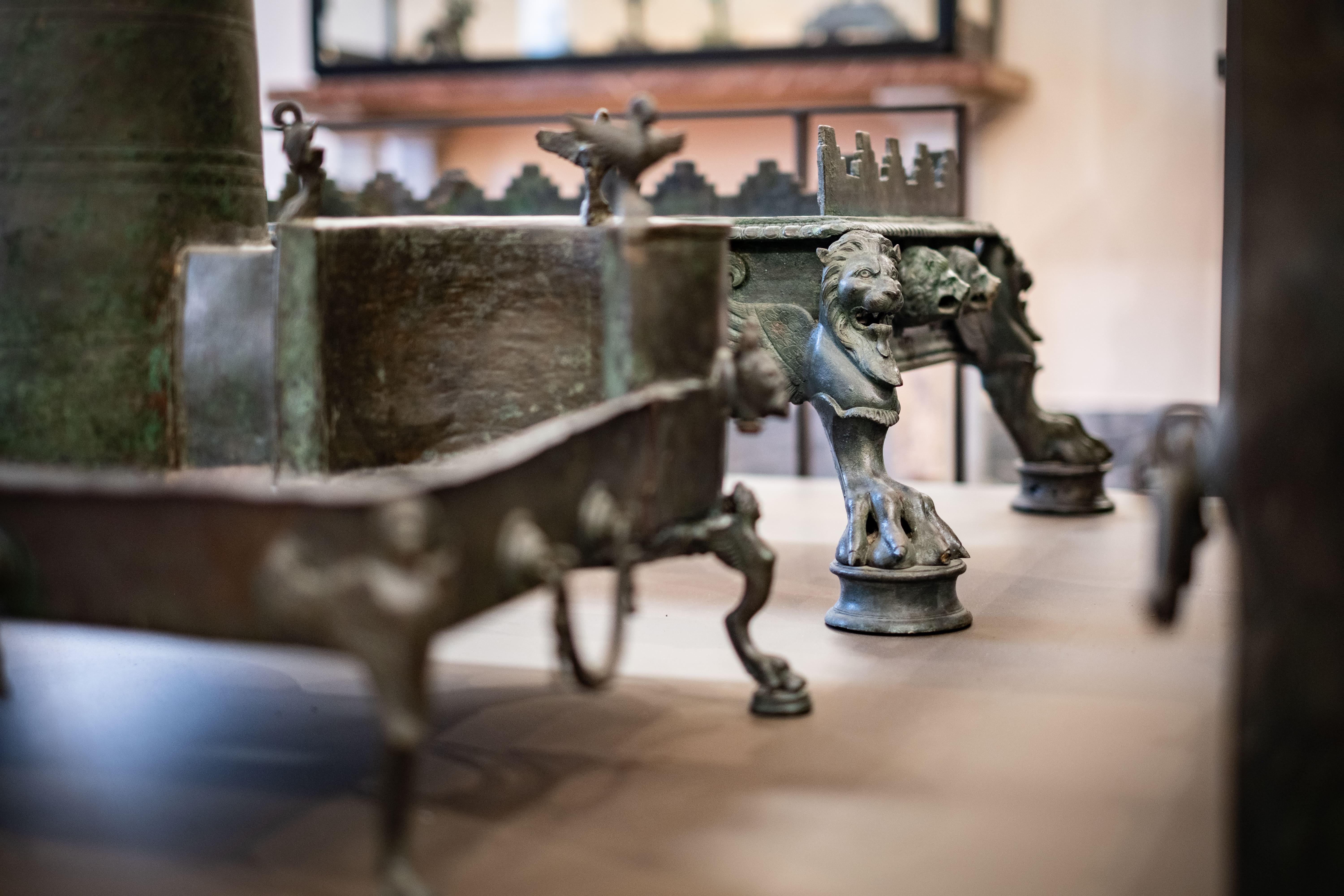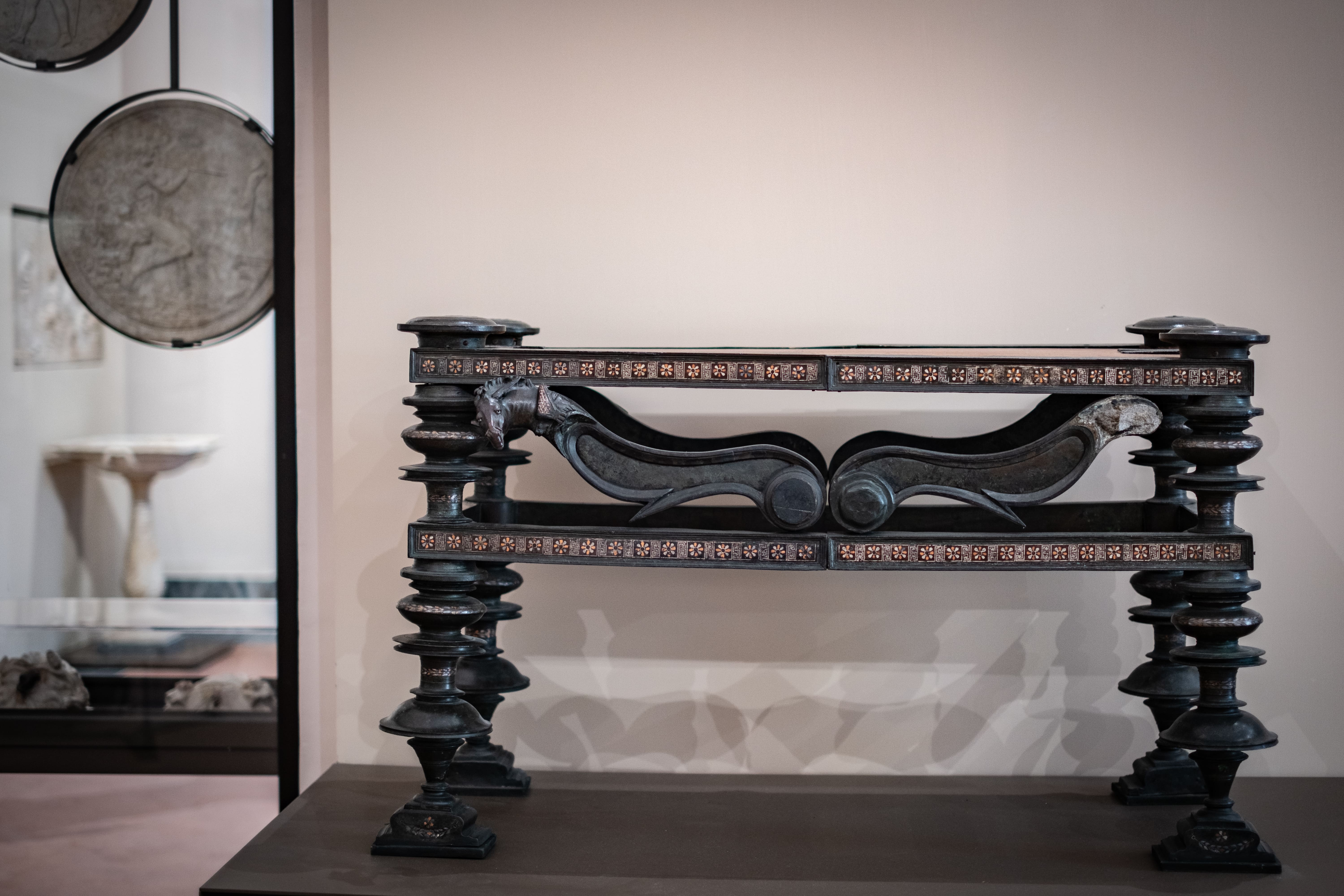 Tra i pezzi più importanti, un raffinato tavolino pieghevole dotato di un complesso meccanismo per facilitarne il trasporto, un monumentale portalucerne impreziosito da superfici ageminate in rame e argento, raffiguranti un giovane Dioniso a cavallo di una pantera, e un grande braciere rettangolare decorato in rame, stagno e ottone.