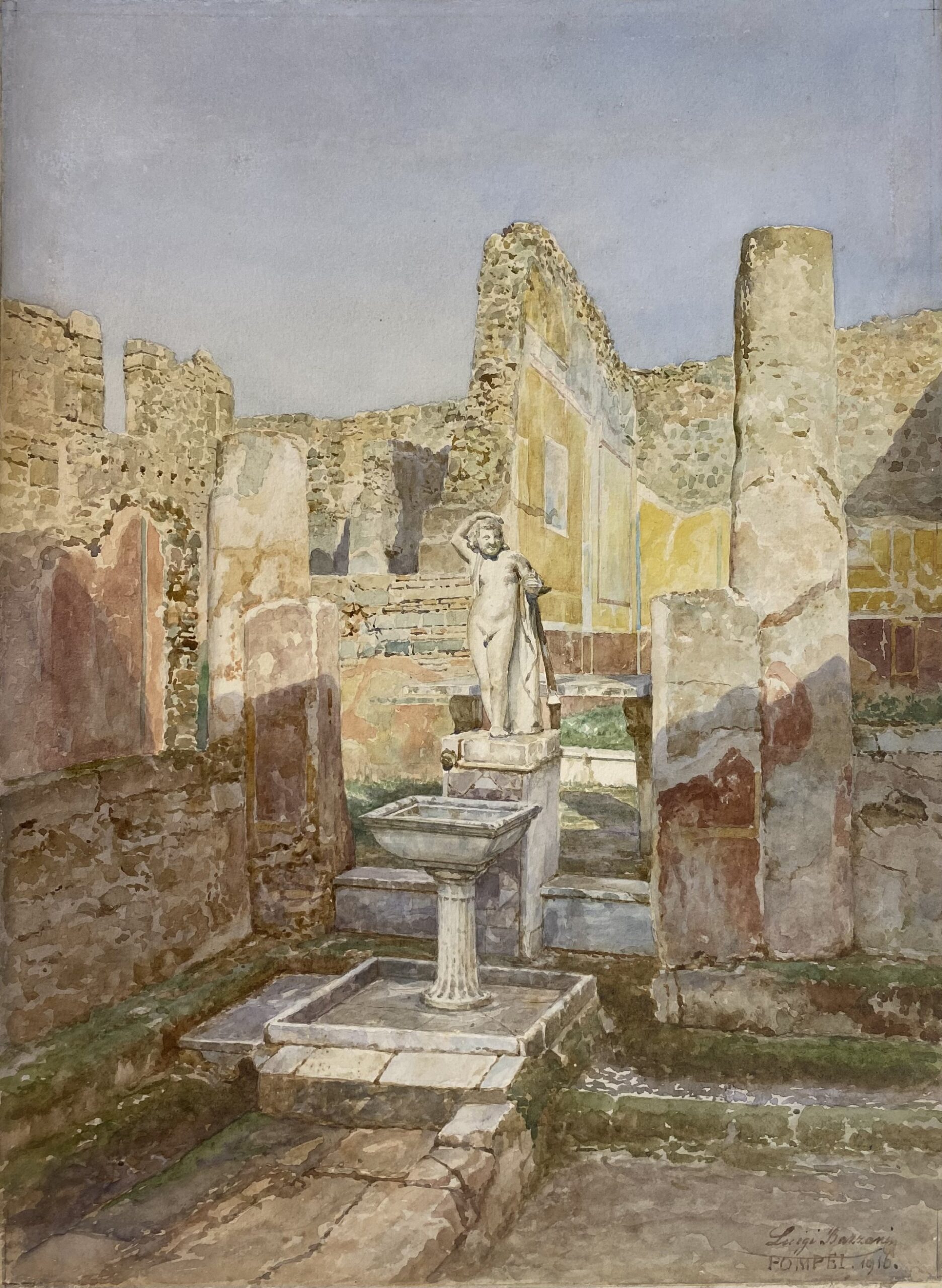 Bazzani traduce in immagini il fascino di domus, templi e giardini, cogliendo con la rapidità dell’acquerello la luce mutevole e le atmosfere effimere degli spazi antichi. Una tecnica che, per immediatezza e sensibilità cromatica, si rivela perfetta nel restituire impressioni e dettagli altrimenti destinati a perdersi. Accanto ai suoi lavori, il percorso include una gouache di Giuseppe Marsigli, disegni di Pasquale Maria Veneri e fotografie storiche, con un focus dedicato alla celebre Casa del Fauno, scoperta nel 1830 e divenuta simbolo della raffinatezza pompeiana.