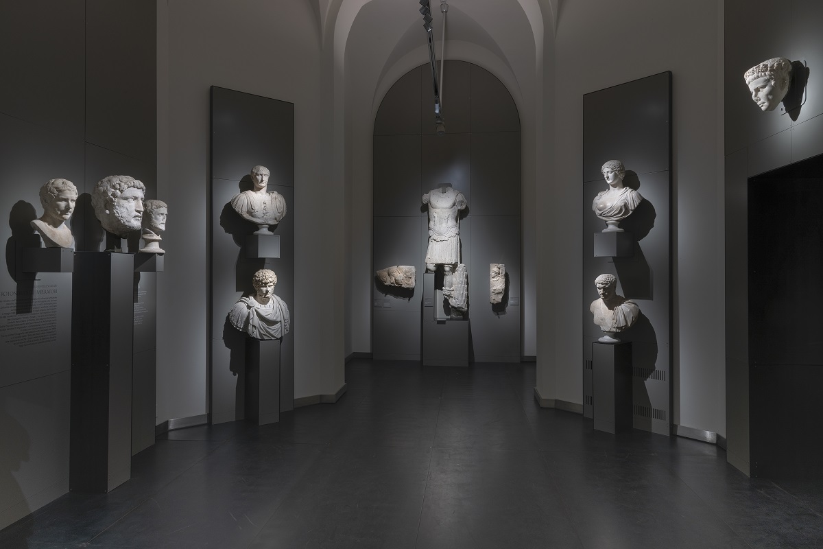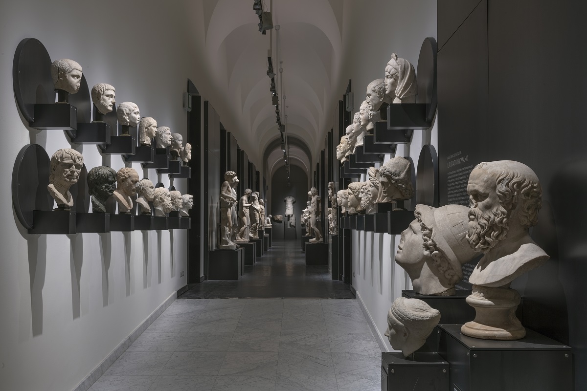 Il corridoio centrale ha il compito di evocare una galleria di palazzo, dove lungo le pareti si allineano statue greche e romane, rilievi scolpiti e busti marmorei, che presentano al visitatore i caratteri salienti della rappresentazione antica: dalle teste-ritratto, vere immagini di propaganda dell’antichità, alle scene di banchetto sui sarcofagi, per poi culminare nella suggestiva Rotonda degli Imperatori, dove i busti dei principali personaggi della storia romana circondano il visitatore.
