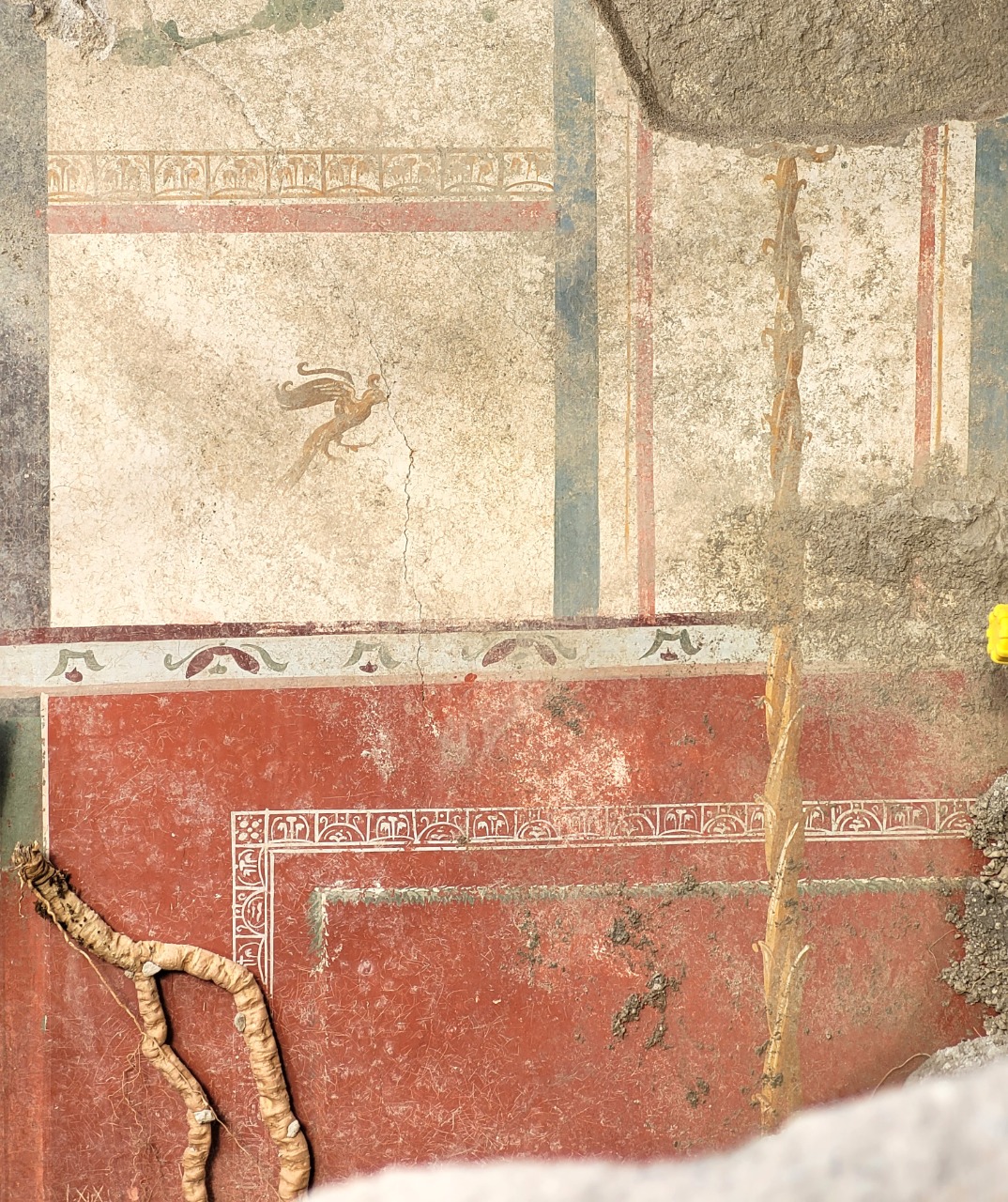 Particolarmente numerose sono le evidenze dei lavori in corso nella casa con il panificio di Rustio Vero, dove è stata già documentata negli scorsi mesi una natura morta con la raffigurazione di una focaccia e un calice di vino. L’atrio era parzialmente scoperto, a terra si trovavano accatastati materiali per la ristrutturazione e su un’anta del tablino – un ambiente di ricevimento -, decorato in IV stile pompeiano con un quadro mitologico con la scena di Achille a Sciro, si leggono ancora oggi quelli che probabilmente erano i conteggi del cantiere, ovvero numeri romani scritti a carboncino, facilmente cancellabili a differenza dei graffiti incisi nell’intonaco.