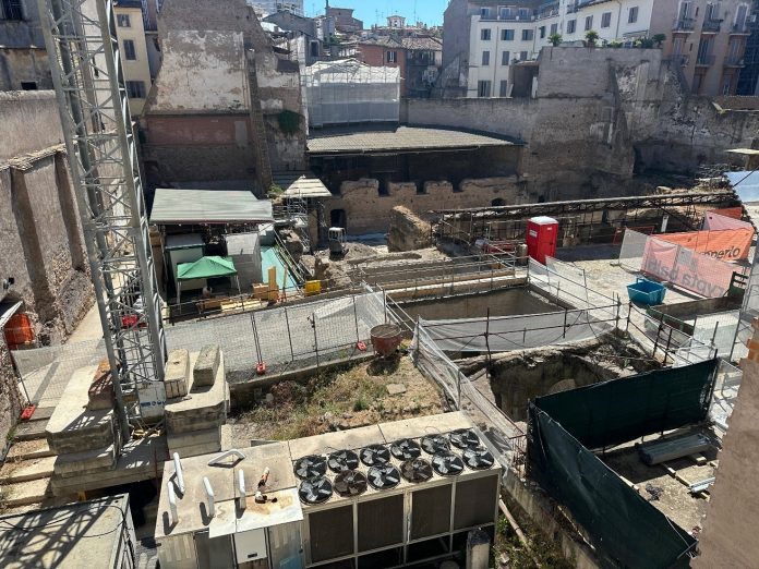L’accesso avviene da via delle Botteghe Oscure. Si entra nel cosiddetto Dormitorio Barberiniano, già parte del convento seicentesco di Santa Caterina dei Funari. Lì, ad accogliere i visitatori, è un video introduttivo curato da Light History s.r.l., per la regia di Mary Mirka Milo, in cui la voce degli archeologi Daniele Manacorda e Federico Marazzi, insieme a quella di Antonella Ferraro, Saveria Petillo, Debora Papetti e Fabiana Cozzolino, racconta la genesi e la complessità del progetto in corso. Ma è l’ingresso nel cantiere vero e proprio, seppur parzialmente accessibile, a rappresentare l’esperienza più pregnante. Il pubblico si affaccia sugli strati vivi della città: murature, lacerti, frammenti, risposte provvisorie. Il cantiere, normalmente dominio dell’addetto ai lavori, diventa qui forma aperta della riflessione storica.