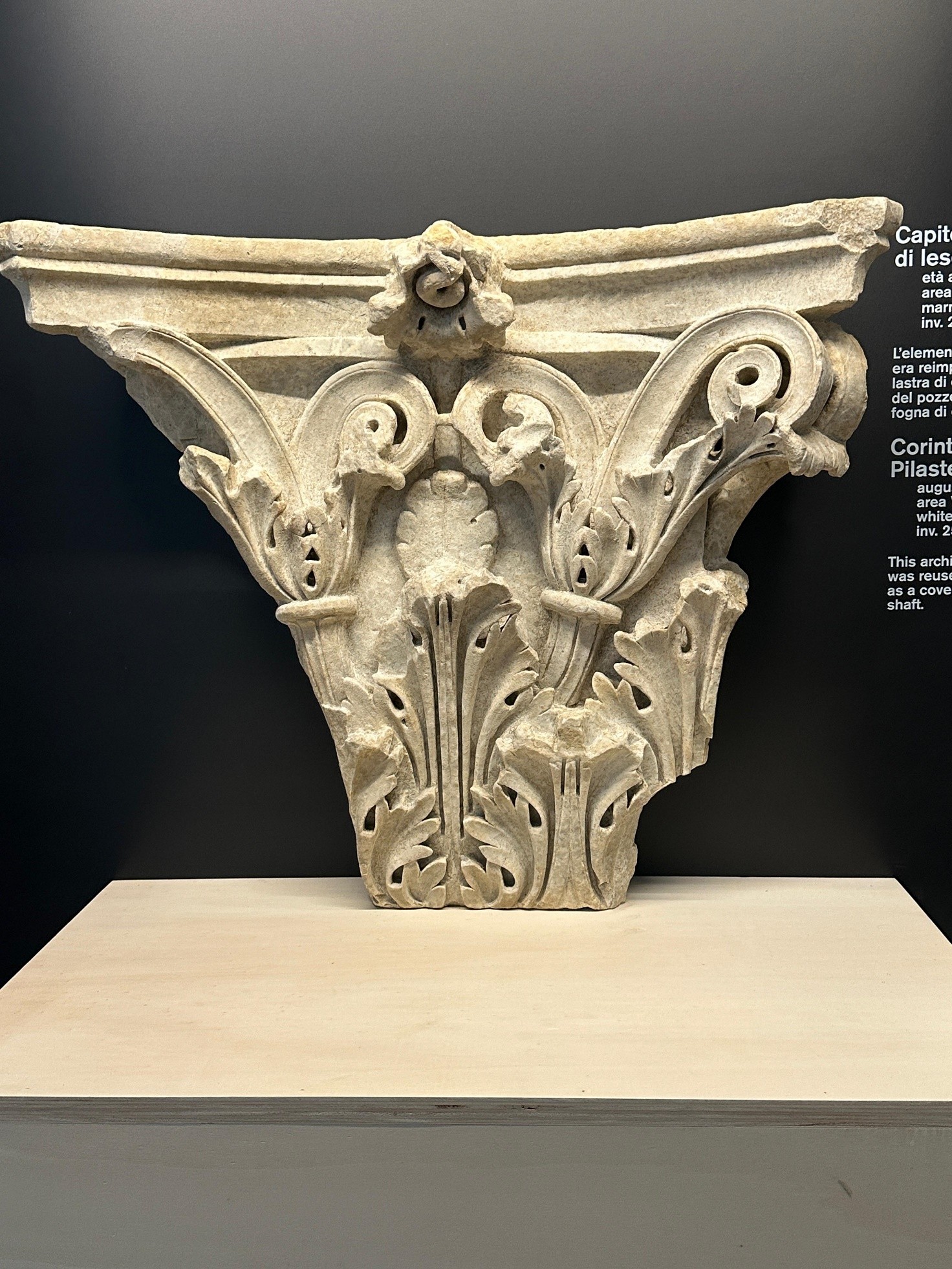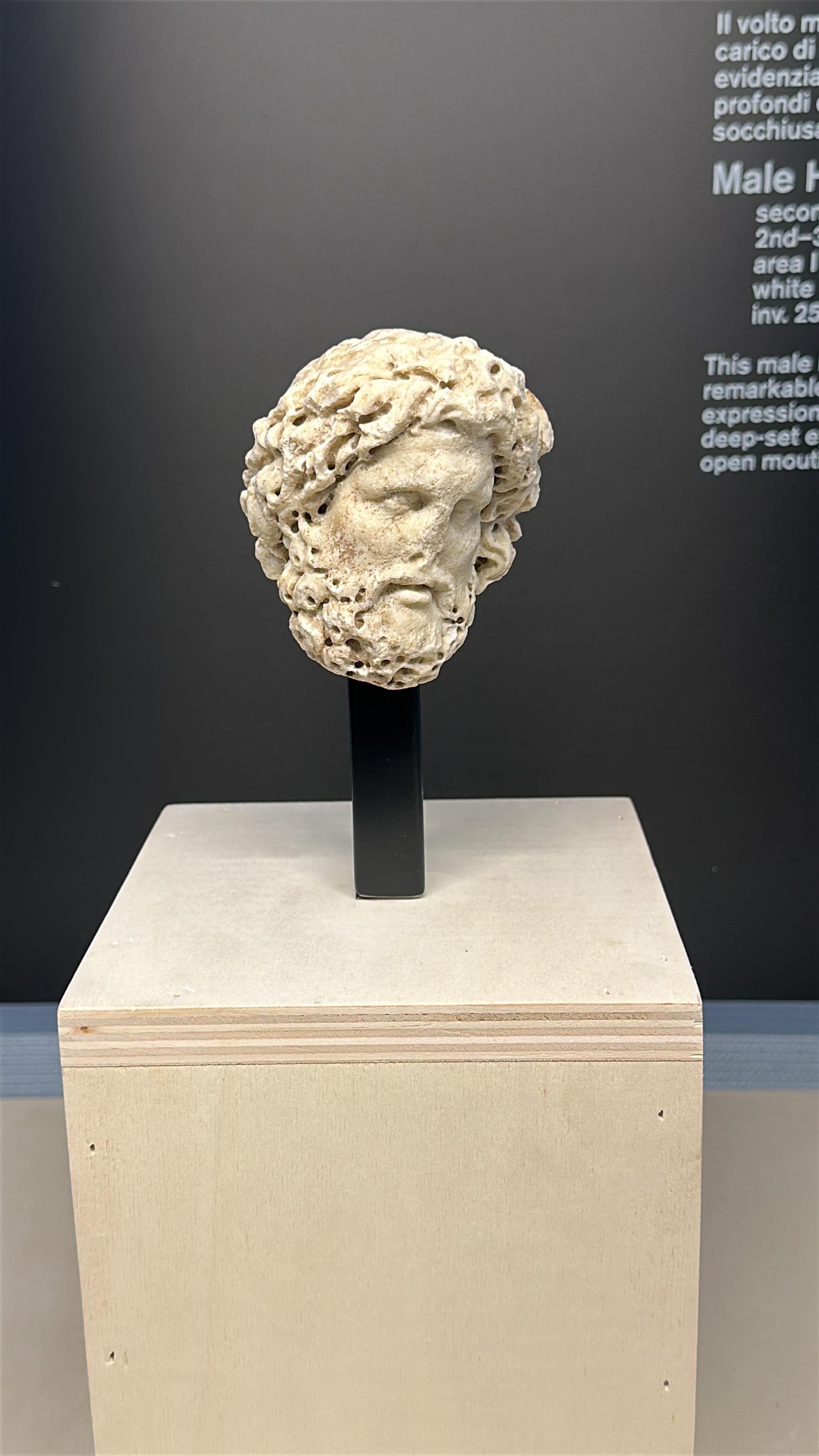 Fra i reperti già visibili lungo il percorso, si distinguono frammenti che raccontano la Roma imperiale e le sue riscritture successive. Un capitello corinzio di lesena, riconducibile per finezza esecutiva all’apparato del Foro di Augusto, fu reimpiegato in epoca tardoantica come lastra di copertura per un sistema fognario. È uno degli esempi più emblematici del destino della città classica, oggetto di riuso, di reinvenzione, di sopravvivenza funzionale. Accanto, spiccano una statuetta del dio Pan, figure acefale drappeggiate in himation e chitone – indumenti diffusi nell’epoca classica -, due teste virili con barbe fluenti e una piccola figura femminile stante. Sono gli idoli muti di un paesaggio cultuale che, nel tempo, è migrato dalla scena al margine, dal tempio monumentale alla nicchia domestica.