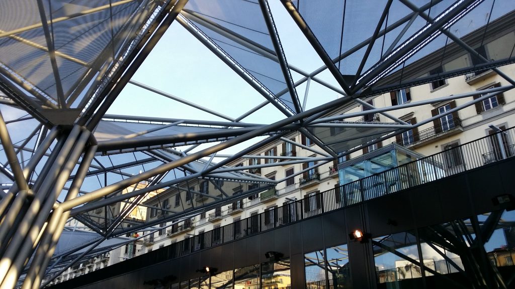 Certo, non si può tacere la relazione negata con la stazione: nonostante la mesh metallica ne riprenda l’idea strutturale, usando dei sostegni ramificati, non è stato risolto l’attacco con lo spuntone attraverso cui la stazione penetra la piazza. Semplicemente, il rettangolo di Perrault risulta male accostato a questo vertice, generando l’assurda contraddizione di una struttura leggera e malleabile che resta rigida anziché adattarsi alla pesante copertura di cemento, anche solo riprendendone l’inclinazione con il lato corto.
