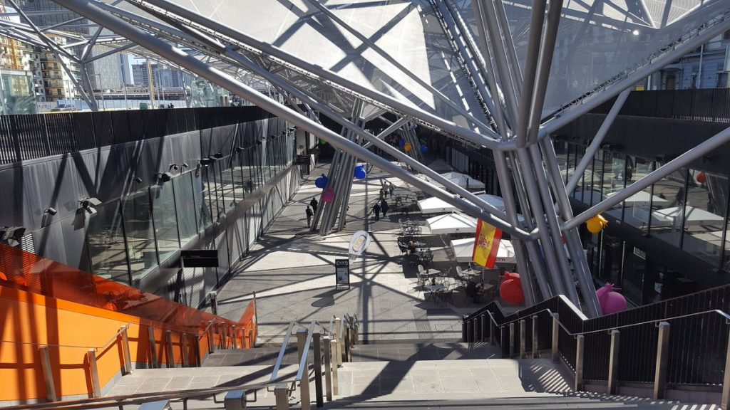 Cresce così una struttura di metallo diafana che sta su sbilenca, incerta, senza chiudere la nuova galleria commerciale ipogea, anzi, aprendola e connettendola al piano della città. Una foresta di acciaio che, oltre a tessere una rete di relazioni tra i diversi spazi della piazza, tenta l’impossibile: rimpicciolire l’immenso vuoto di piazza Garibaldi. Affianco al bordo lungo della struttura, si apre la grande spianata con gli alberi, i piccoli prati e alcune attività collettive.