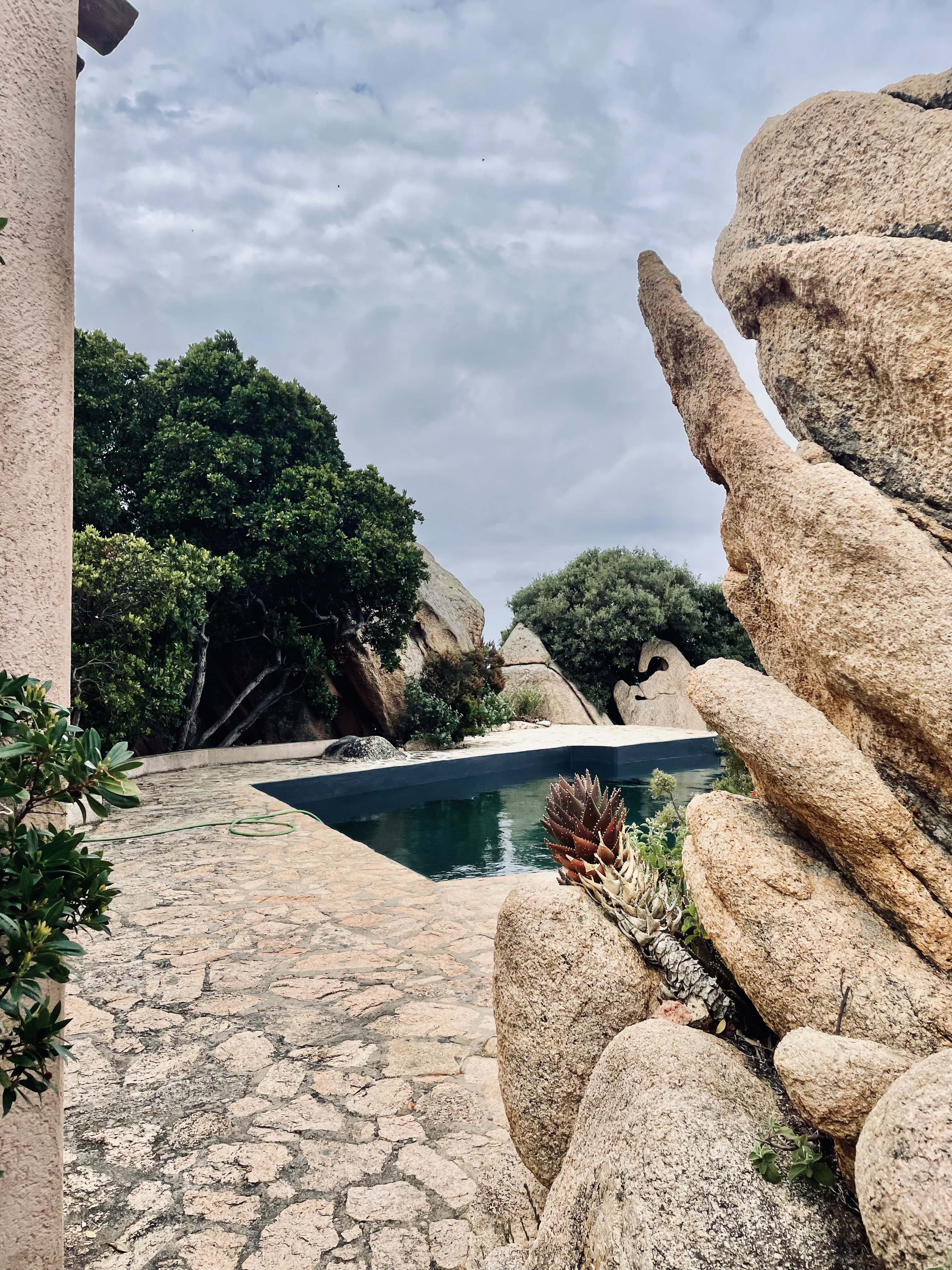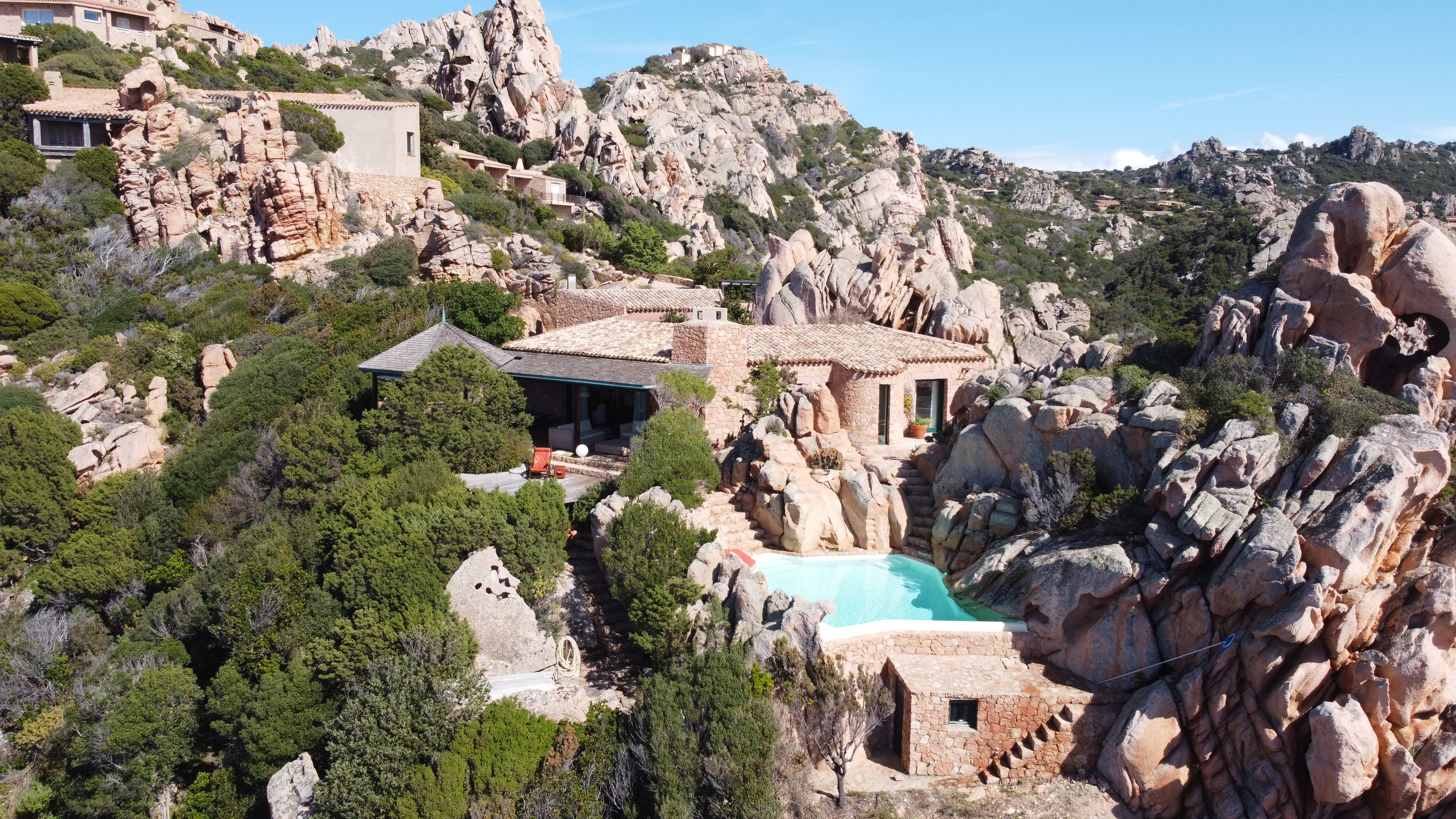 Il vero punto di svolta avvenne nel 1963, quando Ponis si stabilì a Palau, sulla costa settentrionale della Sardegna. Qui, in Gallura, aprì il suo studio e avviò un’intensa attività progettuale che lo avrebbe portato a realizzare, tra gli anni Sessanta e Novanta, oltre 200 edifici residenziali. Sono case integrate nel paesaggio, incastonate tra rocce granitiche e vegetazione mediterranea, ispirate tanto alle forme organiche della costa quanto agli stazzi galluresi, le architetture rurali tradizionali della regione. Ogni edificio si mimetizza nel territorio fino a diventarne parte integrante: muri che seguono le pieghe del granito, volumi che emergono come prolungamenti naturali delle rocce, tetti che si confondono con le linee dei rilievi.