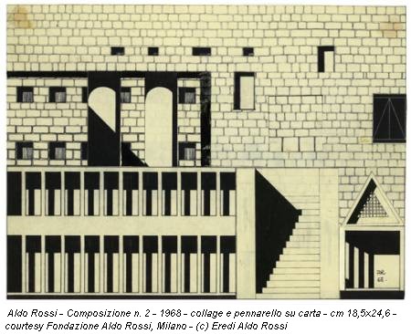 Questi suoi disegni partono proprio dall’attenzione che Rossi pone alla teatralità della costruzione architettonica, una teatralità non retorica, ma necessità teorica di affrancarsi dalla funzionalità in architettura. Traspare la ricerca di un ordine interno che sospende questioni che altrimenti si rivelerebbero pure suggestioni. A sottolineare tutto ciò sono presenti allora gli studi per il quartiere Gallaratese di Milano, i progetti per il Cimitero di San Cataldo a Modena del ‘71, ancora gli studi per la Scuola di Fagnano Olona del ‘72, ma anche il Progetto per l’unità residenziale in zona Vialba a Milano, la planimetria e il prospetto del Teatro della Pilotta, lo studio per il complesso alberghiero e ristorante del Palazzo di Fukuoka o quello per il Palazzo dei congressi di Milano del 1988.