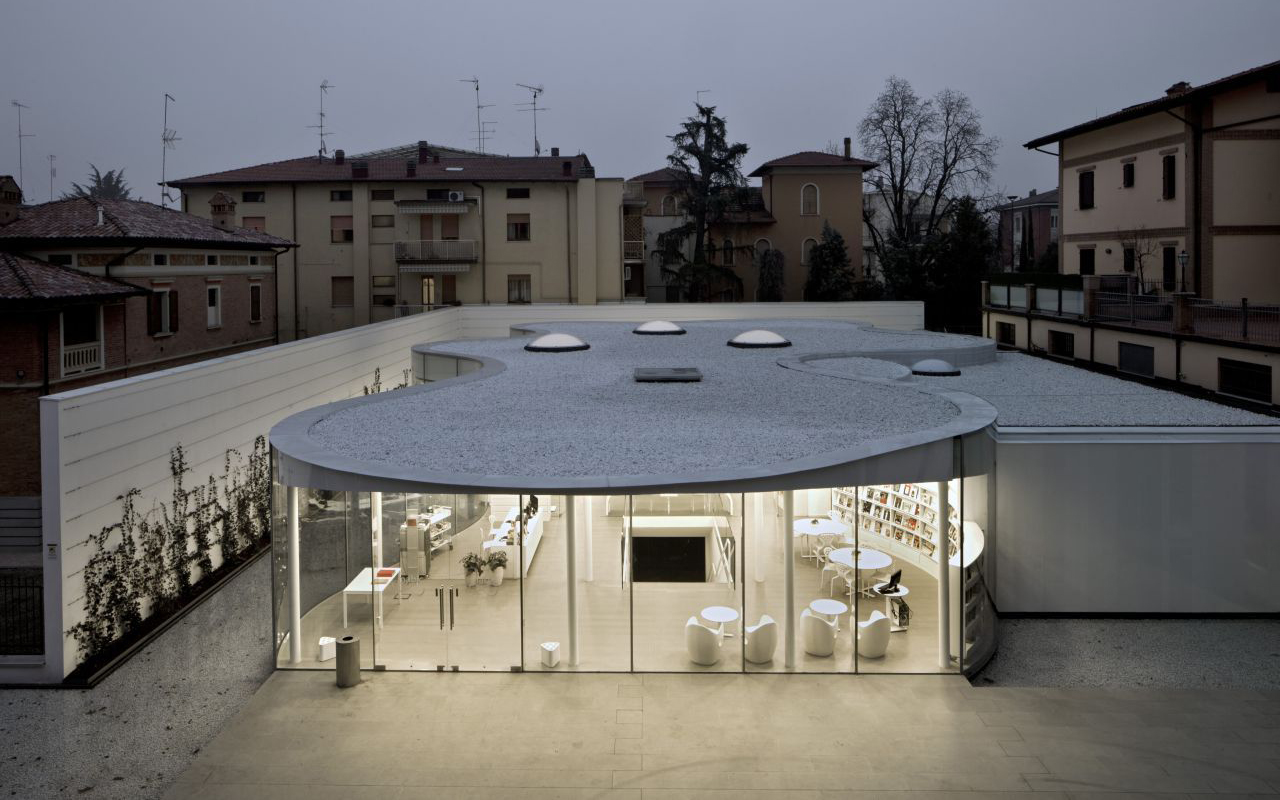 Alla Galleria del Vento di Renzo Piano, alla Cittadella Ferrari di Massimiliano Fuksas e al fabbricato per l’assemblaggio dei motori di Jean Nouvel, che contribuiscono a rendere il comune di Maranello una sorta di area expo di architettura contemporanea, si è aggiunta nel 2011 la Biblioteca progettata dallo studio Arata Isozaki e da Andrea Maffei; una struttura che si sviluppa all’interno del tessuto residenziale con linee sinuose, curvilinee, tracciate da ampie vetrate che segnano il perimetro dell’edificio e che simulano la fluidità dello specchio d’acqua che le circonda. Caratteristiche principali sono l’atmosfera essenziale, la luminosità e la trasparenza dei materiali, l’armonia tra le componenti architettoniche e la vitalità del paesaggio naturale circostante (le facciate est, nord e sud sono interamente ricoperte di edera); tutti elementi che danno vita a uno spazio leggero, dinamico, aperto verso il contesto urbano e il visitatore.