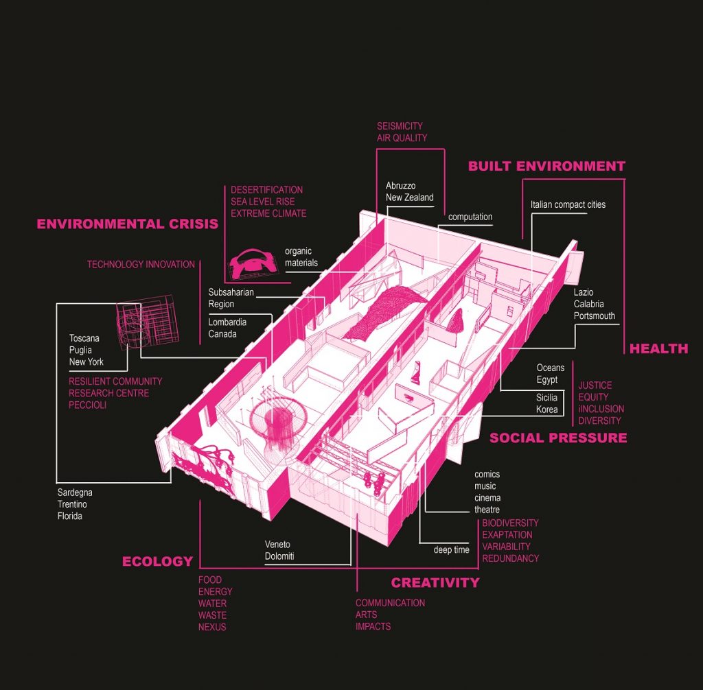 A. Melis: “L’idea che sottende il progetto è che il Padiglione Italia sia esso stesso una comunità resiliente, costituita a sua volta da comunità che rappresentano le singole sezioni, intese quindi come laboratori, centri di ricerca o casi studio, piuttosto che come tradizionali sezioni espositive. Il termine “comunità” definisce allo stesso tempo un luogo fisico ed un contesto sociale coeso. Il termine “resilienza” implica la capacità di trasformazione e adattamento necessaria per rispondere localmente alla globalità ed interconnessione delle attuali sfide economiche, sociali ed ecologiche; esse non possono né devono più essere considerate come entità separate ed autonome e sono state precisamente identificate dall’ONU nei 17 Obiettivi dello Sviluppo Sostenibile alla base dell’Agenda 2030. Ognuna di queste sculture funzionanti è dotata sia di un proprio programma funzionale predefinito sia della possibilità della cooptazione funzionale di parte delle proprie componenti una volta inserite all’interno del palinsesto e quindi sottoposte all’influenza, alle relazioni ecologiche e alle dinamiche del contesto come riflesso delle potenziali costrizioni ambientali”.