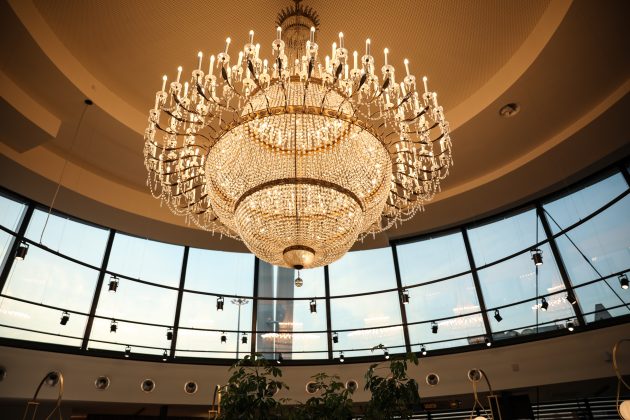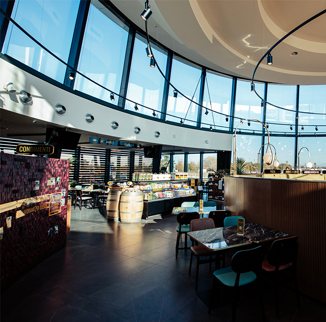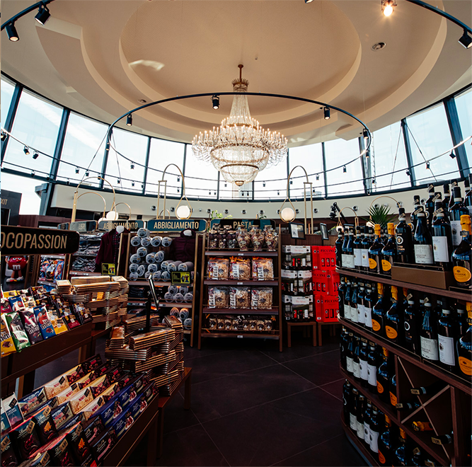 C’è ancora il grande lampadario a gocce di cristallo, al centro dell’edificio, uno degli elementi più riconoscibili della struttura, insieme alla cupola, le cui circonferenze si riflettono nella pianta circolare dello spazio attraversato da milioni di automobilisti in tanti anni e occupato da bar, ristorante – con un mobilio dal fascino vintage e poco ingombrante, come del resto compete a esigenze simili – e dalle folte schiere degli espositori, ricchi di prodotti dal packaging tipicamente “autostradale”.