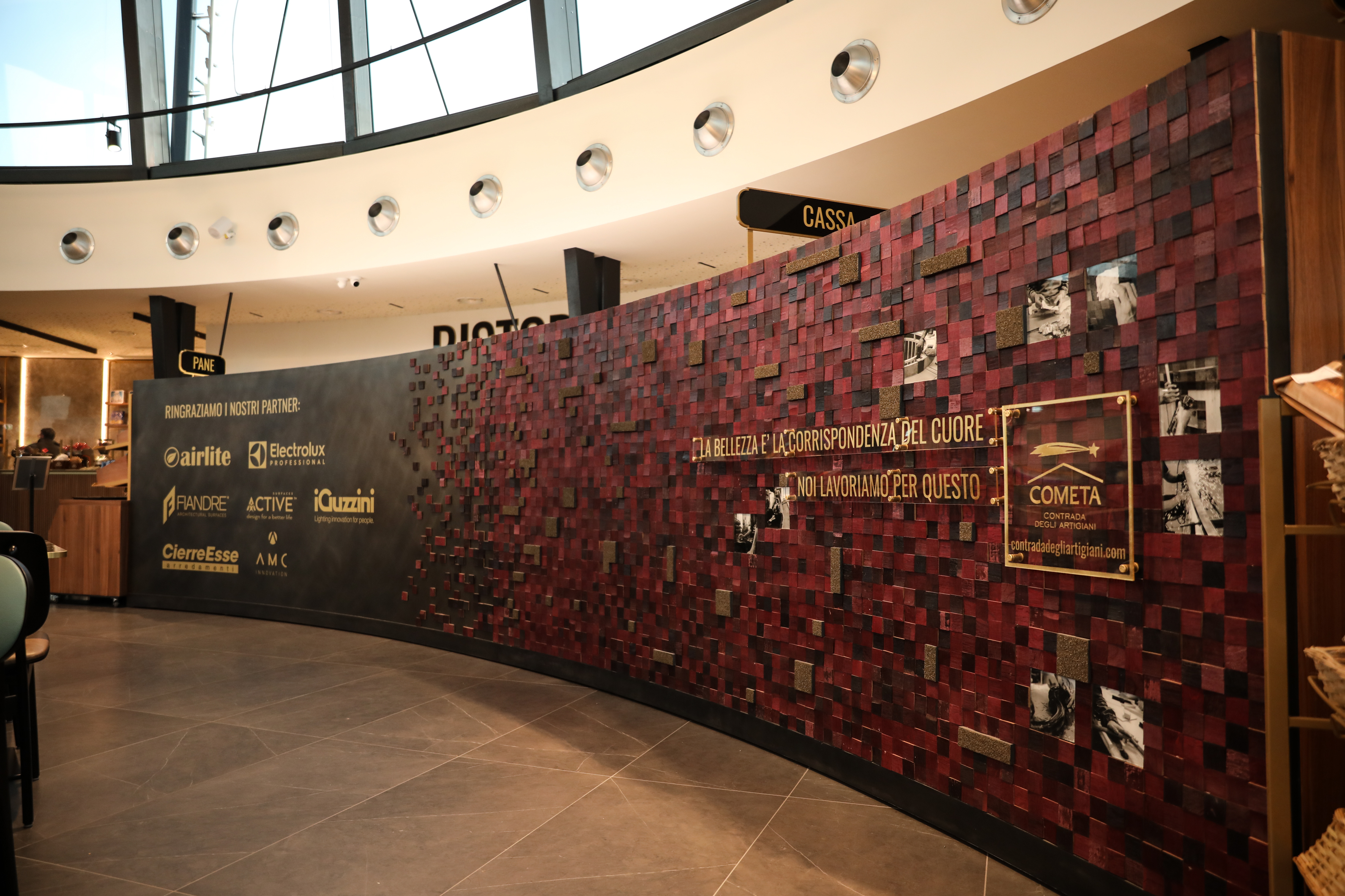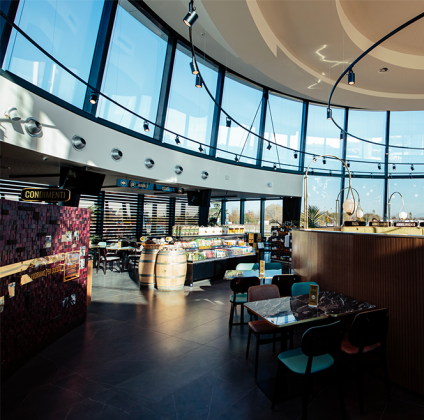 È rimasta l’alta cupola a tripode, mentre l’edificio sottostante, a circa 20 metri, l’astronave aerodinamica, prima demolita, è stata poi ricostruita in maniera fedele, pur adeguandola ai più moderni standard edilizi. I materiali utilizzati per l’interno sono ispirati alla tradizione del design italiano, come il legno di noce, il marmo e l’ottone ma con un occhio all’innovazione e alla sostenibilità. Per per gli arredi, infatti, sono stati utilizzati materiali rispettosi verso l’ambiente e derivanti dal riutilizzo di scarti di lavorazione di prodotti utilizzati nei punti vendita Autogrill, in particolare, il WASCOFFEE®, materiale sviluppato e brevettato da Autogrill, ottenuto dagli scarti del caffè.