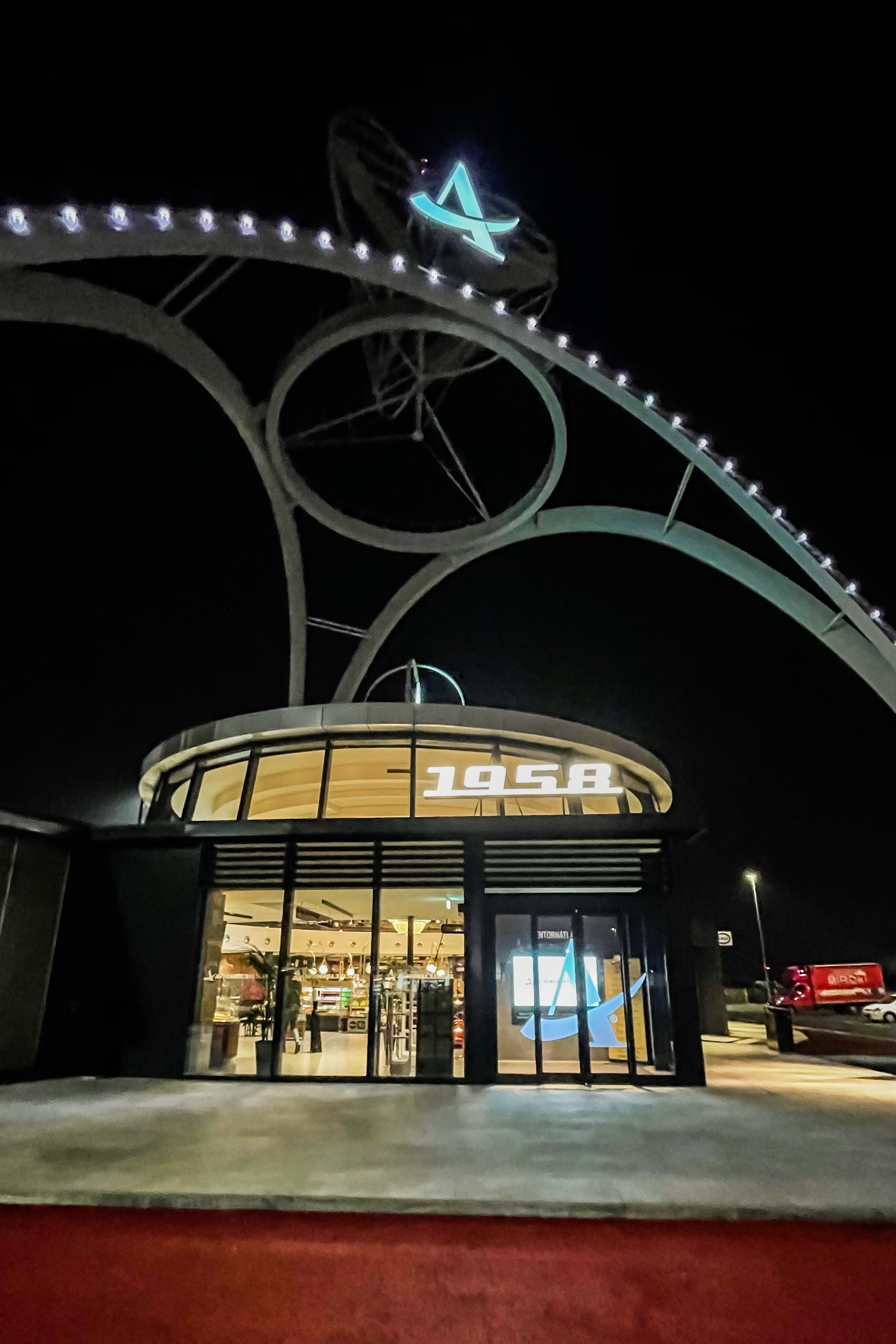 Si completa così il rifacimento dell’intera area, un progetto di adeguamento strutturale ed energetico che aveva interessato anche l’altro Autogrill, immediatamente prospiciente, il Villoresi Est, caratterizzato dall’altrettanto iconica “vela” che, adesso, ritorna a dialogare con “l’astronave”. Che, inaugurata nel pieno di una fase di espansione dei consumi e di ottimismo per il futuro, sembra mandare, a noi contemporanei, un messaggio di fiducia.