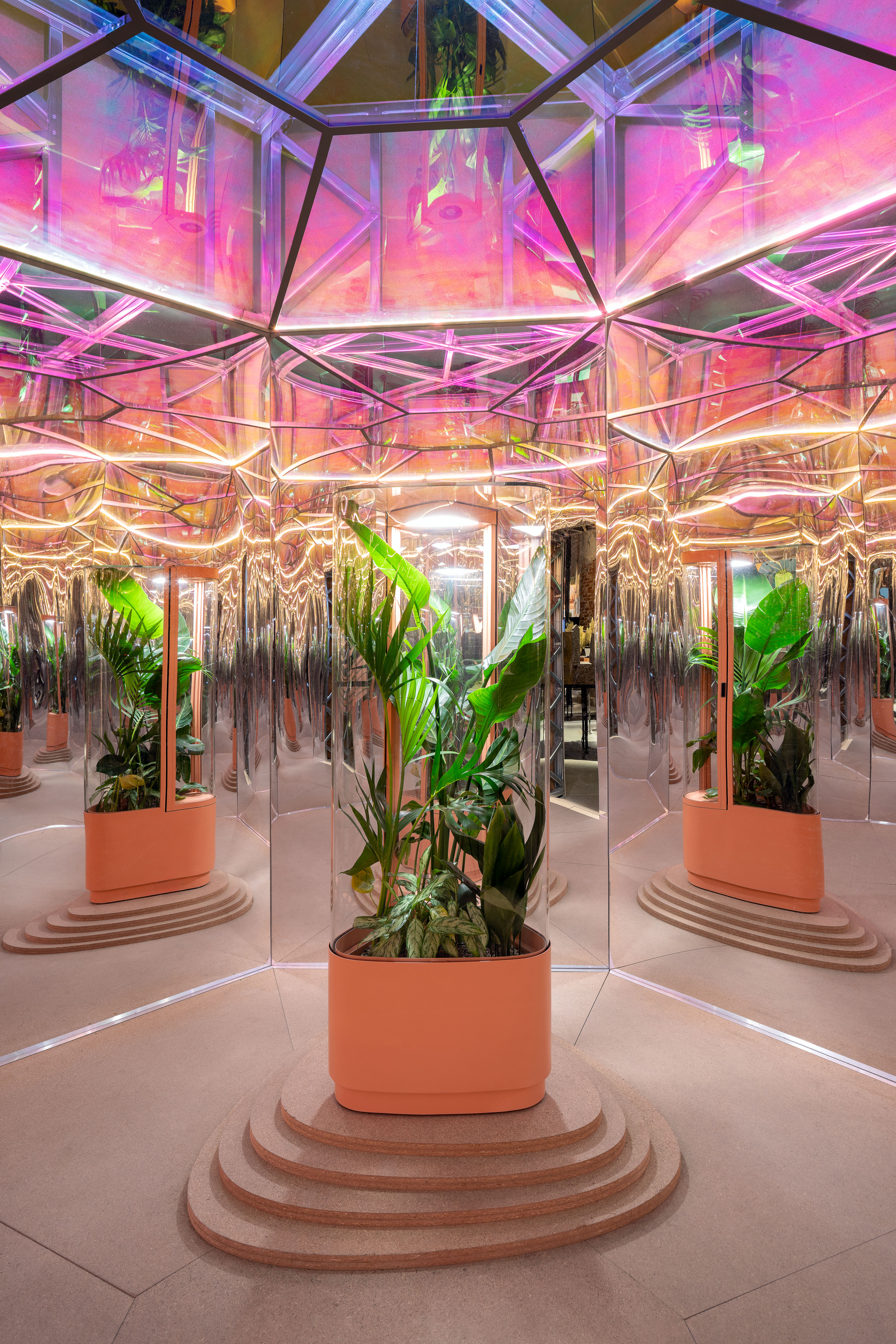 Lo spazio è una serra-totem ottagonale, leggera, smontabile, rivestita con una malta a base di lolla di riso e calce aerea. All’interno, pareti a specchio e un soffitto cangiante moltiplicano la presenza di piante come Monstera, Strelitzia, Ficus, radicate in un substrato brulicante di microrganismi. Grazie alla tecnologia brevettata Stomata, questi organismi catturano sostanze inquinanti come formaldeide, VOC e particolato fine. I dati scorrono in tempo reale su display digitali: la scienza diventa esperienza sensibile, prova tangibile che la natura possiede già gli strumenti per la nostra salute collettiva.