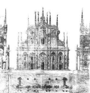 Milano si trova nel crocevia di questo dibattito e mano a mano che la costruzione avanza smantellando la primitiva chiesa, si sposta nel tempo il problema della facciata che, a fine ‘500, non può non assumere le forme del manierismo di Pellegrino Tibaldi. Sarà questo suo progetto la pietra di paragone per tutti i disegni successivi in quanto rivela la capacità di Pellegrino, già allenato dai lunghi lavori di riforma voluti da san Carlo Borromeo, ad innestare le nuove forme sulla struttura gotica. Era questa un’indicazione emersa quasi un secolo prima da Bramante quando, interpellato sul tema del tiburio, esortava a non rompere l’ordine de lo edificio, bensì a cercare la congruenza con l’impostazione dell’organismo gotico e completare l’apparato decorativo con le forme direttamente deducibili dal realizzato o dai disegni del tempo in cui questo Domo fu edificato.