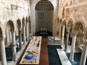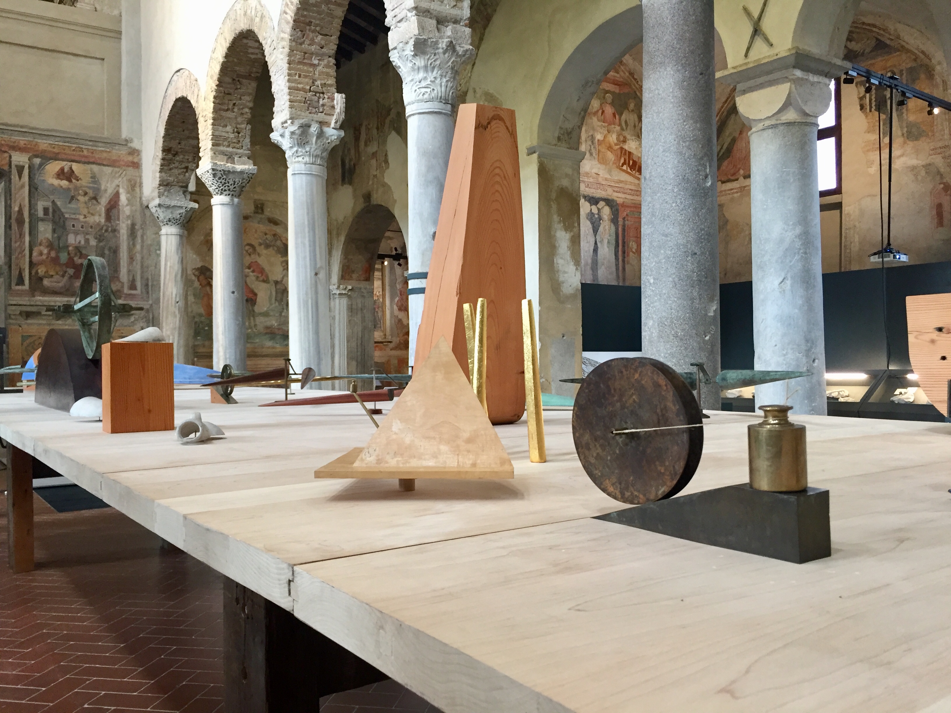 Scendono nella basilica, la sezione espositiva “Metafore dell’orizzonte e della natura, il linguaggio artistico”, il linguaggio artistico di Juan si legge attraverso la scultura. Oggetti, installazioni, che parlano di fisica, di gravità come si può leggere dalle 31 piccole sculture disposte sul grande tavolo della navata centrale, come La colonna e il peso oppure La ruota e il peso realizzate negli anni ‘70. Di grande suggestione sono gli studi che Juan Navarro dedica al tema della luce zenitale. Ne sono un esempio il progetto a scala territoriale pensato per il fiume Charles di Boston per il quale l’architetto intendeva utilizzare una sorta di installazione a meridiana, utilizzando delle boe che si illuminavano durante il passaggio del sole dall’alba al tramonto.