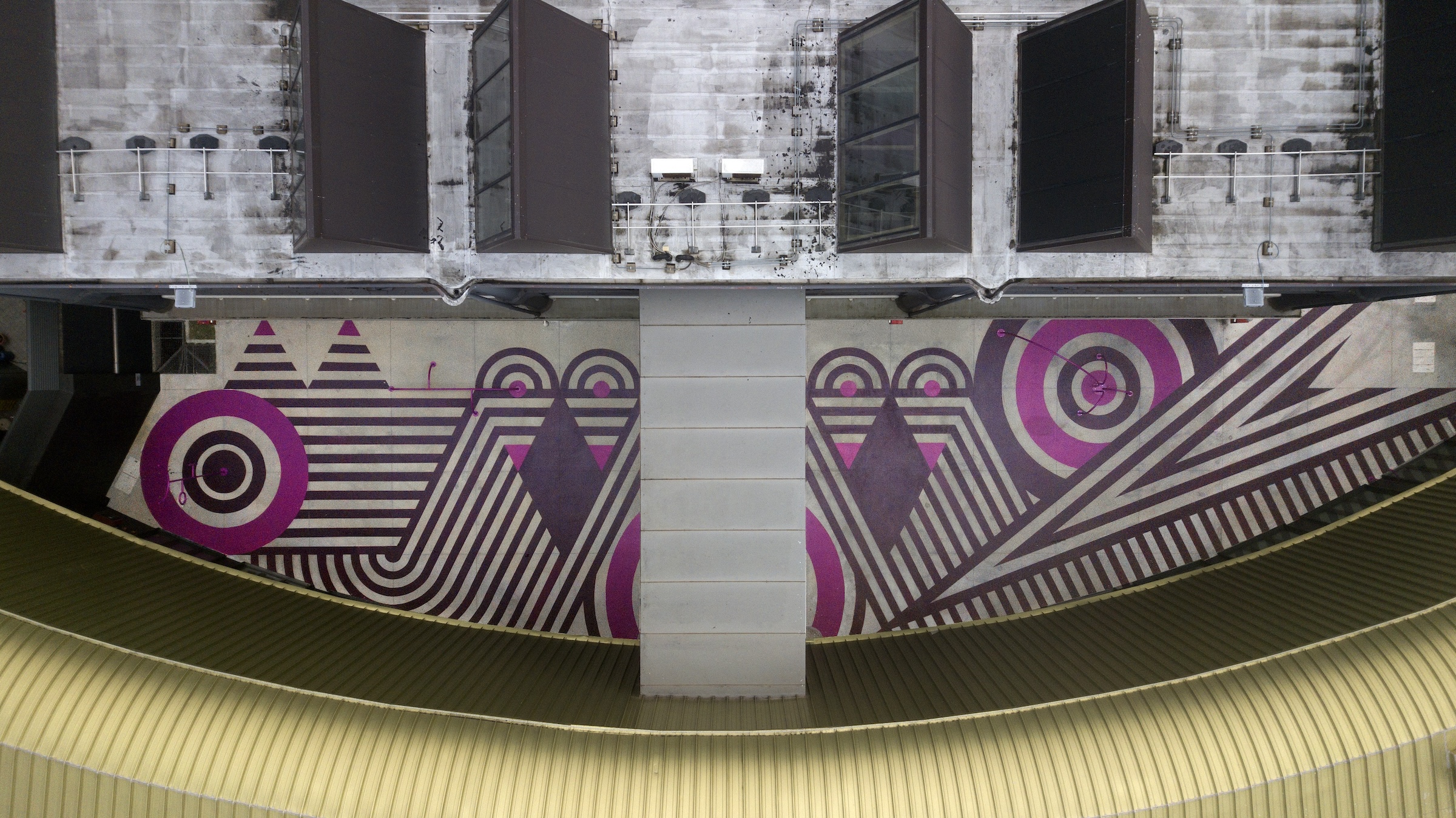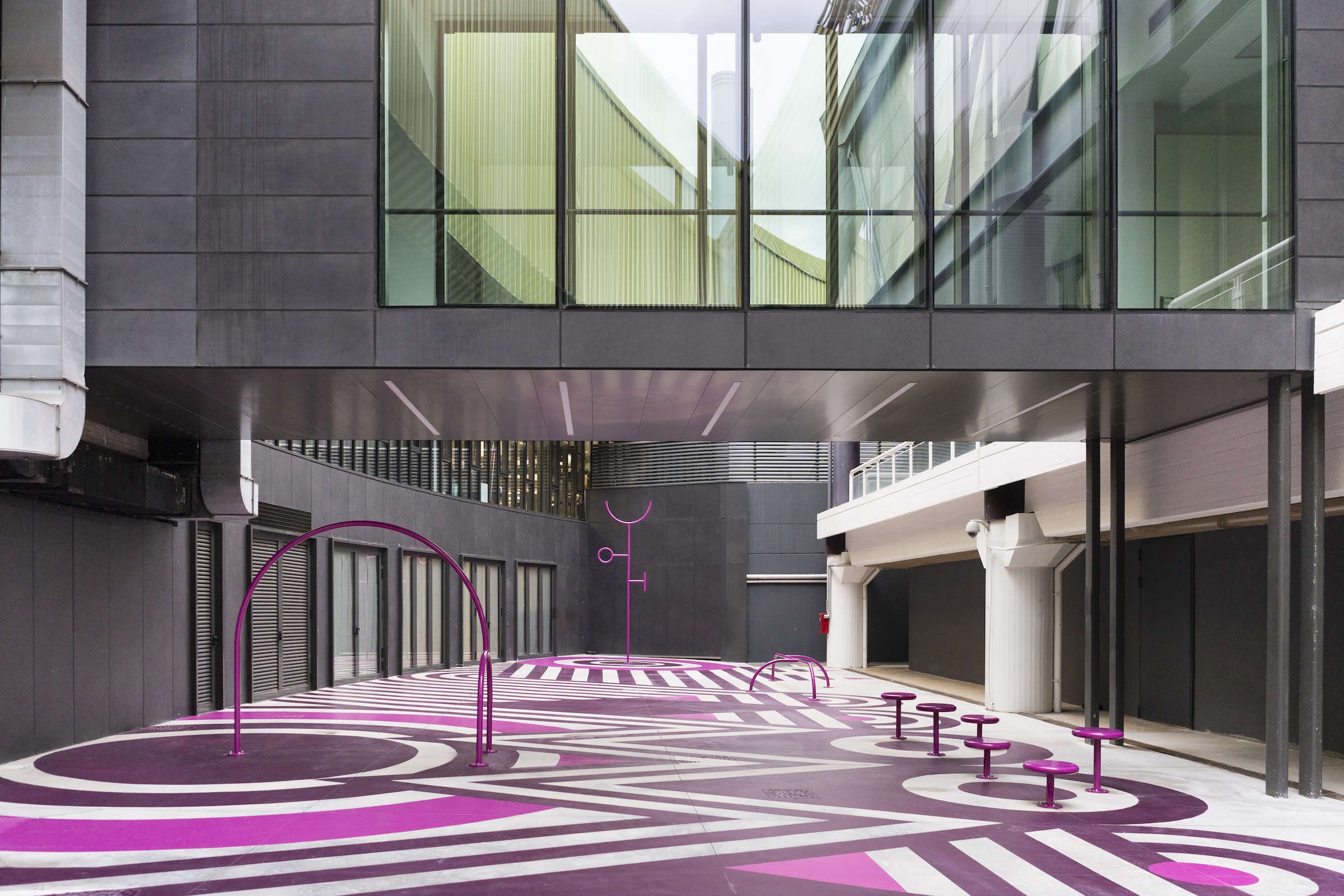 L’area, in prossimità del percorso di ingresso, è stata progettata per accogliere giovani e giovanissimi dai 3 ai 17 anni, favorendo l’interazione sociale ma anche una sensibilità individuale e collettiva verso l’arte e la creatività contemporanea. Partendo dalla rielaborazione dei principi geometrici delle due architetture, quella modulare di Gamberini e quella circolare di Nio, ECÒL con Luca Boscardin ha dato forma a un inedito playground, prevalentemente vuoto e al contempo denso e vivace, aperto all’interazione, abitabile. Le geometrie si intrecciano in un disegno a terra che assume le fattezze di un animale fantastico. Elementi tridimensionali emergono dal tappeto geometrico, suggerendo alcune parti del corpo come la bocca, le antenne, gli artigli, una cicatrice, la coda dell’animale.