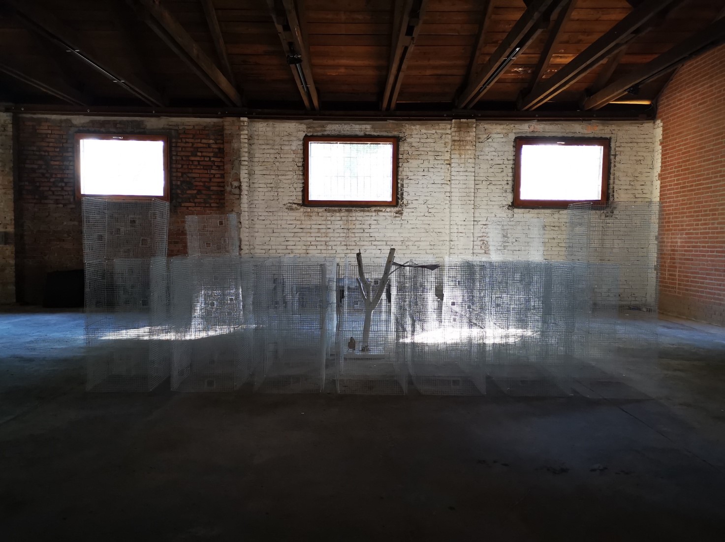 Questa unione, al contempo virtuale e reale, viene rappresentata da He Duoling e Shi Jindian (Enclosure 500x500x10) con delle gabbie in filo galvanizzato, installate nel perimetro di un grande weiwu, mentre Ying Tianqi (Fish and fishing 150x116x50) appronta una installazione che riproduce un weiwu in scala nel quale convivono 18 pesci rossi. L’acqua e i pesci rappresentano il legame simbiotico tra la fortezza, i suoi abitanti e la natura. I pesci, come gli individui che in queste abitazioni vivono, sono sorvegliati costantemente da telecamere che ne monitorano i movimenti. Una sorveglianza digitale sulle comunità, che in tempo di pandemia è diventata ormai la norma quotidiana.