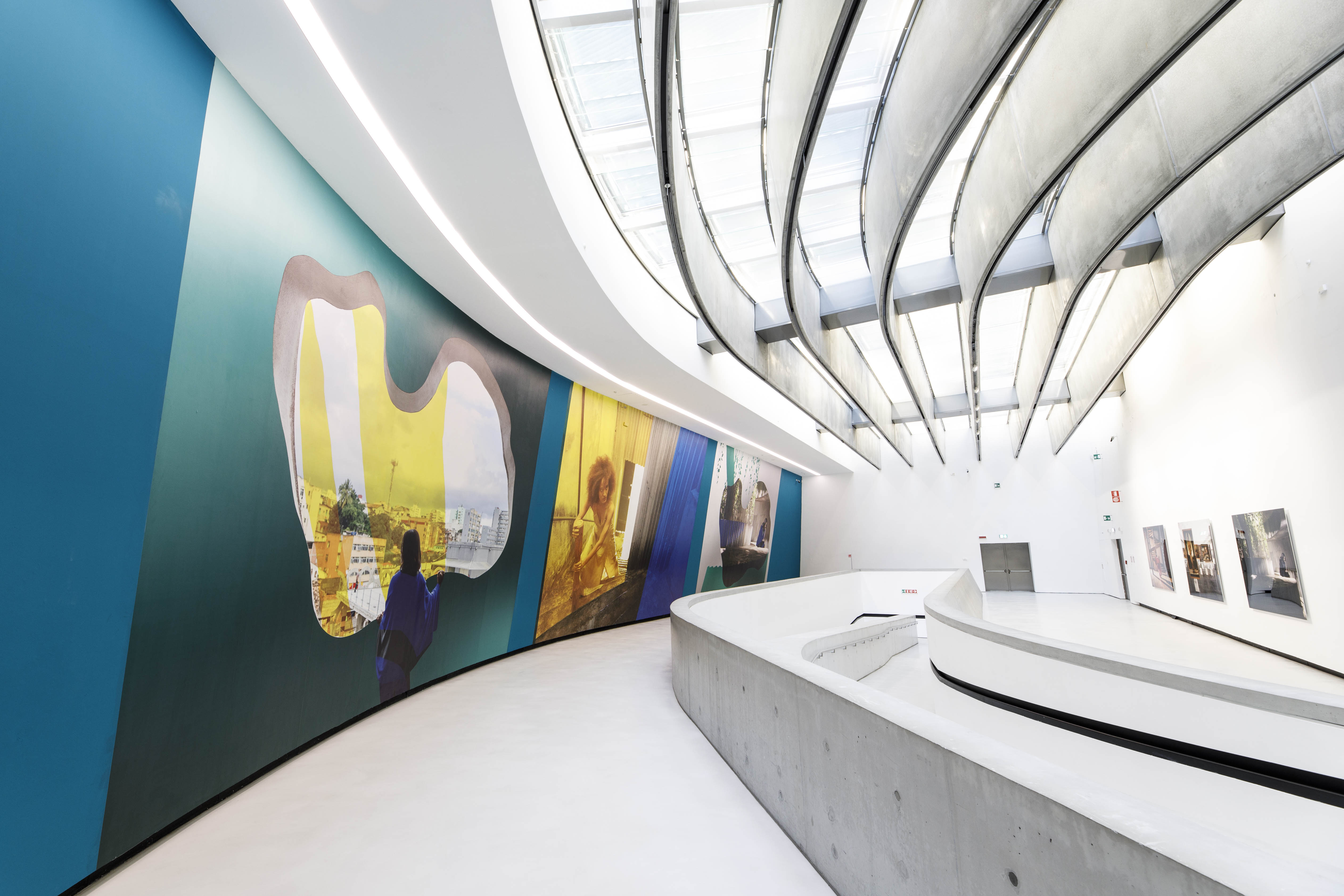 Esposta precedentemente presso la sede londinese della galleria Victoria Miro, la monumentale installazione di Isaac ridisegna completamente la sala della Fondazione, donando un inedito dinamismo allo spazio. Delimitata da due teatrali sipari scuri, la Galleria 3 si trasforma in un palcoscenico su prendono vita i nove schermi sospesi. La mitologica Lina viene raccontata in un film a più livelli con immagini coreografate alternativamente e simultaneamente. Proprio come “un meraviglioso groviglio”, la pellicola si rifà a una concezione ciclica del tempo in cui ogni cosa è armoniosamente interconnessa. La ritmicità dei movimenti e la drammaticità dei suoni si fanno prepotentemente spazio all’interno della narrazione, diventando la struttura portante del linguaggio espressivo. Le attrici brasiliane Fernanda Montenegro e Fernanda Torres, madre e figlia nella realtà, interpretano rispettivamente una Lina matura e una più giovane, offrendoci uno sguardo intimo dell’architetta grazie alla rilettura di alcuni dei suoi scritti che ci parlano di libertà collettiva e della poetica essenzialmente rigorosa dell’architettura. È di poesia che si fa portavoce anche la pratica di Julien, narratore mosso dall’urgenza espressiva di un linguaggio poetico veicolato dal video.