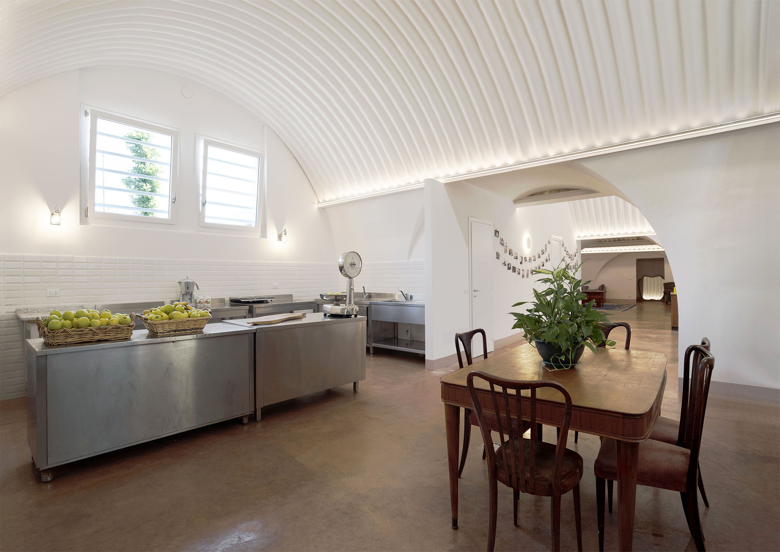 Dopo un anno e mezzo BLOX è riuscito a far confluire nelle caratteristiche tecniche dell’intervento gli obiettivi a sfondo sociale dell’associazione che abita lo spazio. L’esito di questo felice e al contempo complesso connubio ha favorito la vittoria di un bando di rigenerazione urbana a coprire la quasi totalità degli investimenti. In uno spazio caratterizzato da tre arcate con tre altezze differenti il principale intento è stato restituire una superficie aperta e flessibile, senza vincoli che avrebbero potuto compromettere un utilizzo “differenziato”, come attività di laboratorio, di cucina e un mercatino di frutta e verdura oltre ad un’area idonea a ospitare attività di svago e intrattenimento.