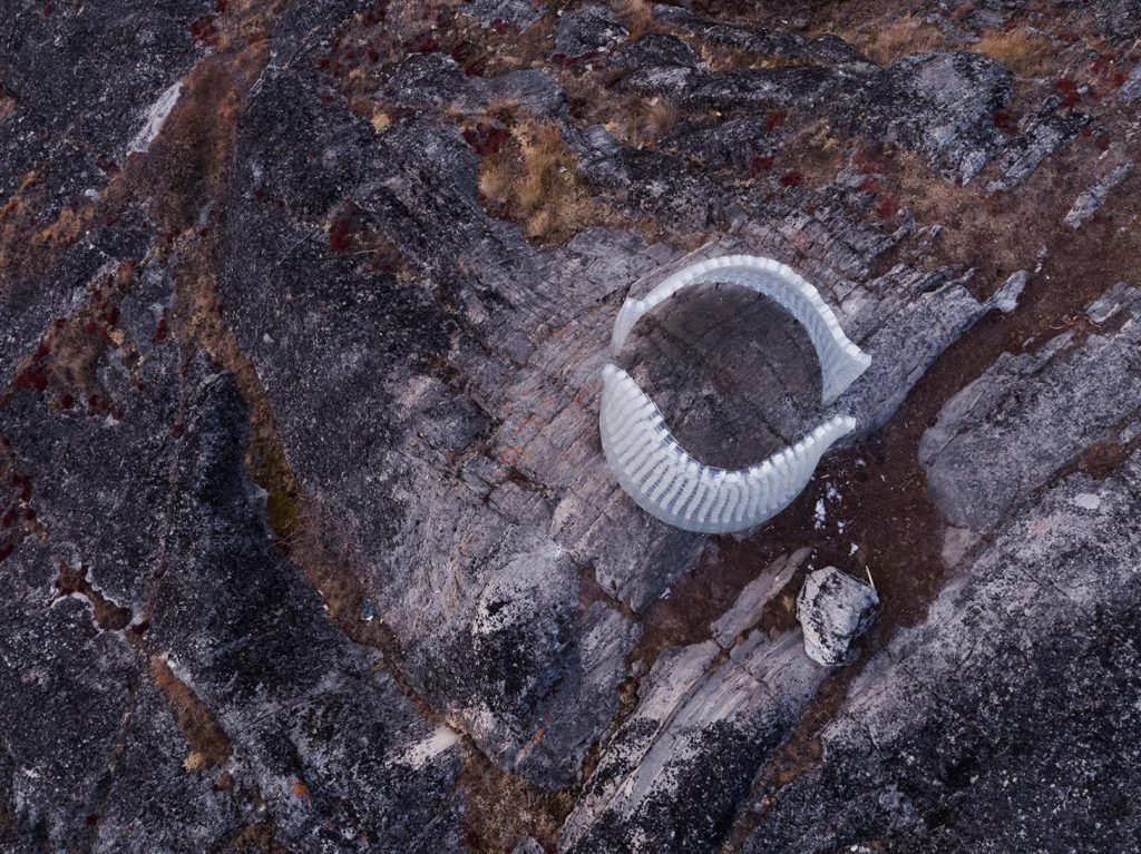 Con una popolazione di 100 abitanti, Sarfannguit è, in termini groenlandesi, grande e prospera. Molti dei villaggi più piccoli del paese sono abbandonati e in rovina. L’industrializzazione e la politica del governo danese di trasferire gli abitanti dei villaggi in città più grandi, in particolare la capitale, Nuuk, hanno lasciato la Groenlandia disseminata di villaggi fantasma. Sarfannguit è infatti l’unico centro attivo rimasto nella nuova area da poco nominata Patrimonio dell’Unesco, mentre nelle vicinanze si trova un villaggio abbandonato. Ikonomidis immagina il suo padiglione come collegamento tra i due avamposti, tra passato e presente. È anche pensato per essere un waymaker o un faro su un sentiero escursionistico pianificato tra Sarfannguit e Nipisat, un’estensione dell’attuale sentiero del Circolo Polare Artico e quindi un mezzo per attirare l’attenzione dei visitatori sul villaggio.
