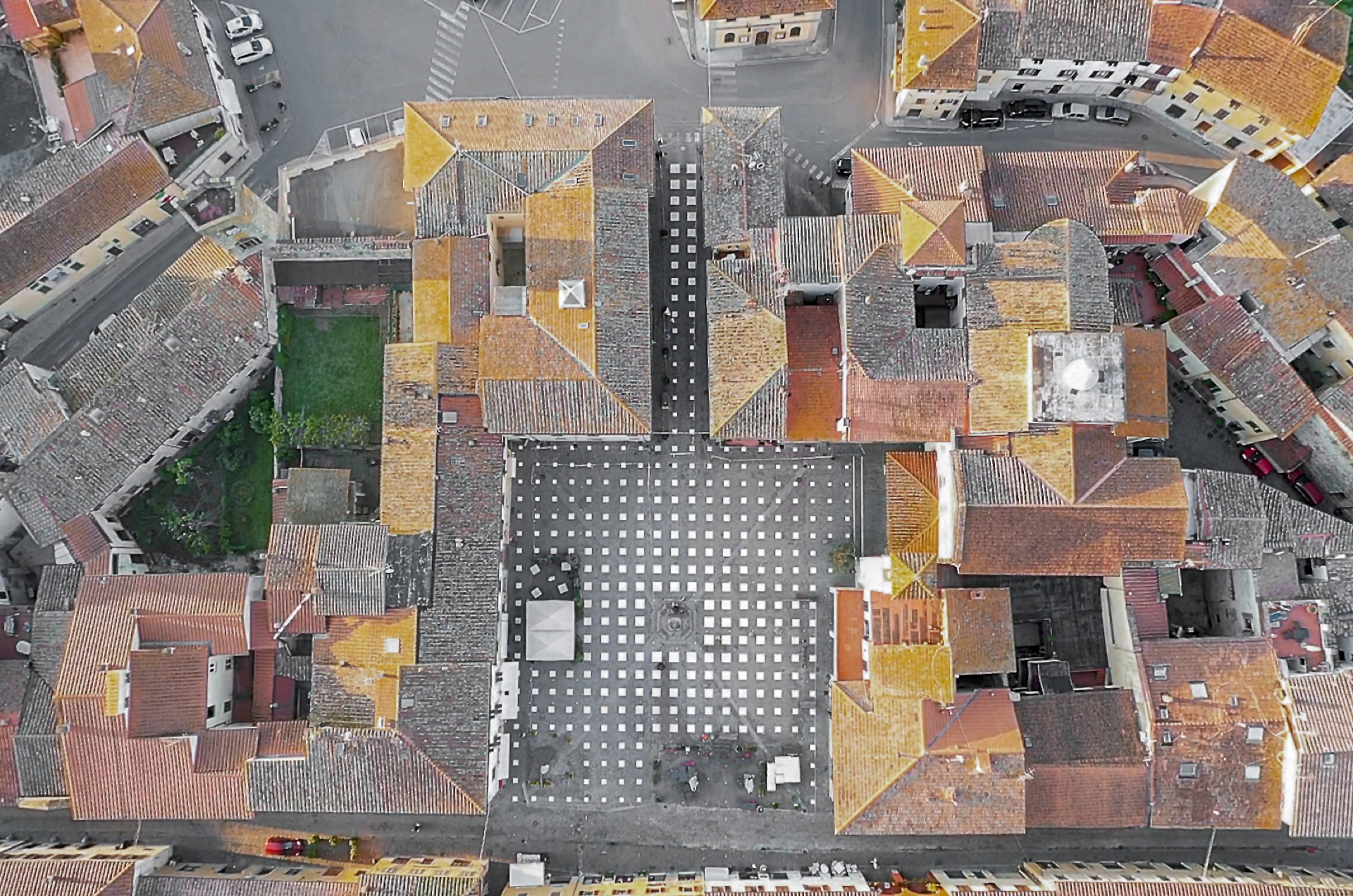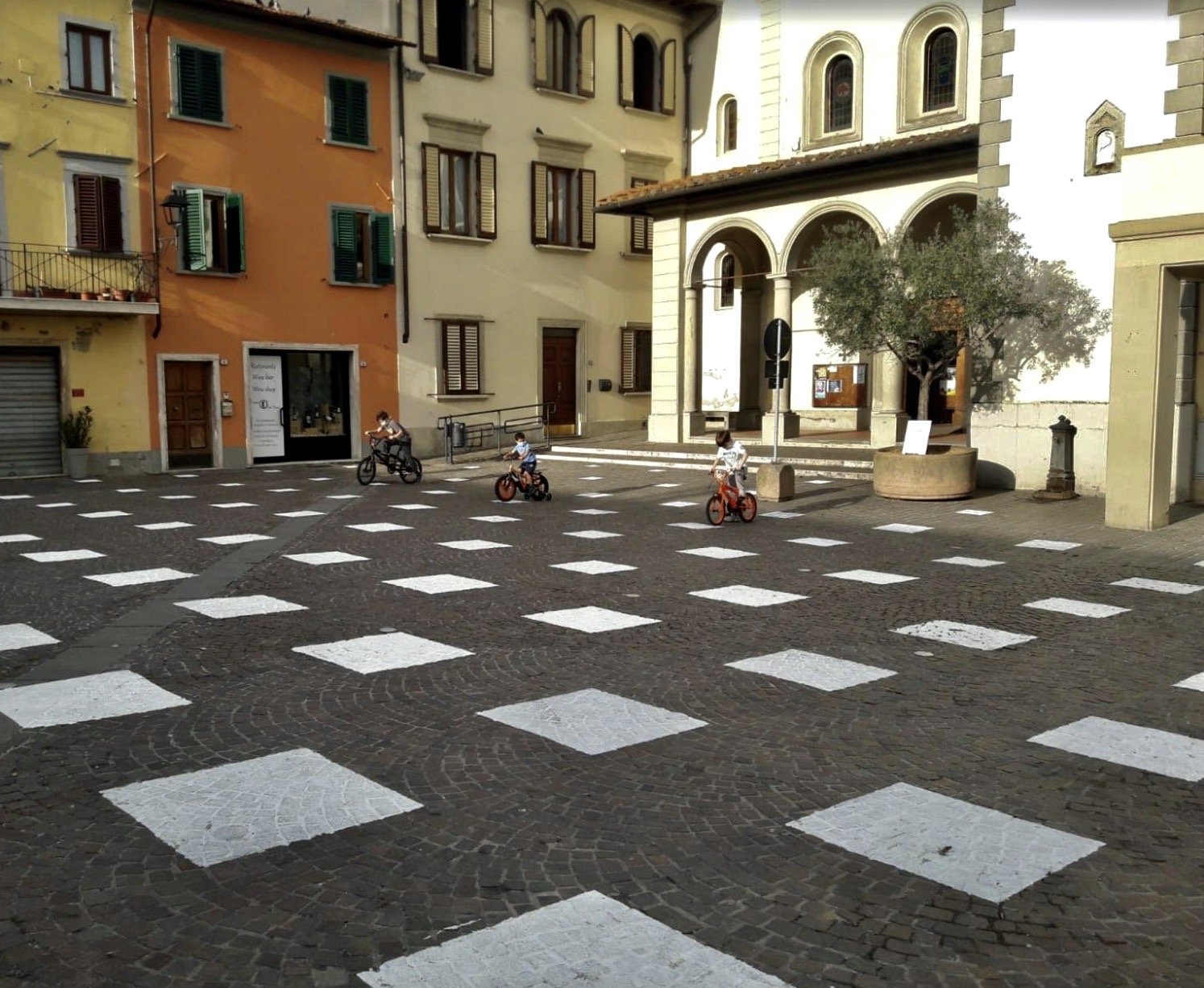 Una misura che è divenuta strumento di progettazione per costruire una griglia di piccoli quadrati bianchi,  dipinti con vernice rimovibile che crescono di dimensioni man mano che arrivano al centro della piazza.